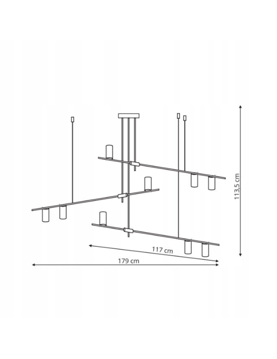 Wymiary lampy są imponujące: wysokość wynosi 113,5 cm, a szerokość to 179 cm. Lampa wykorzystuje 9 źródeł światła typu GU10, które zapewniają wystarczające oświetlenie i umożliwiają dowolną regulację jasności. Warto dodać, że lampa nie zawiera źródła światła w komplecie, co daje możliwość dopasowania żarówek do indywidualnych potrzeb oraz preferencji oświetleniowych.