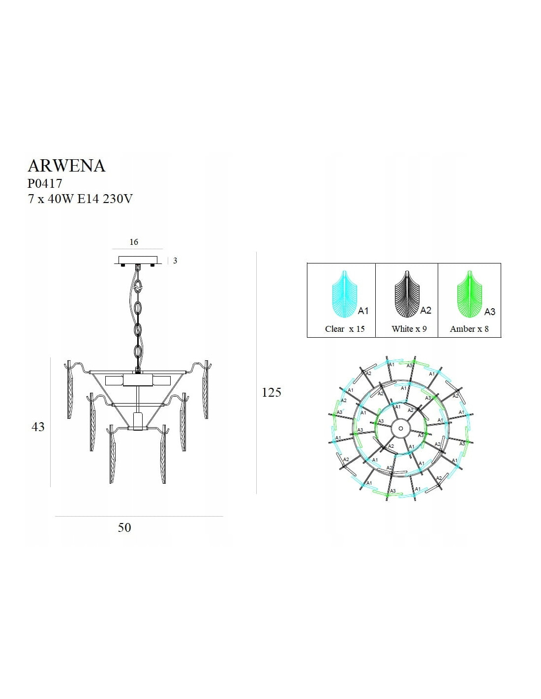 Nasza lampa ma wysokość maksymalną wynoszącą 125 cm oraz średnicę klosza wynoszącą 50 cm, co sprawia, że idealnie nadaje się do różnorodnych przestrzeni. Konfiguracja z siedmioma punktami świetlnymi z gwintem E14 pozwala na dobranie odpowiednich źródeł światła według własnych preferencji, zapewniając optymalne oświetlenie. Warto zaznaczyć, że lampa nie zawiera źródła światła w komplecie, co daje możliwość dostosowania jej do własnych potrzeb.