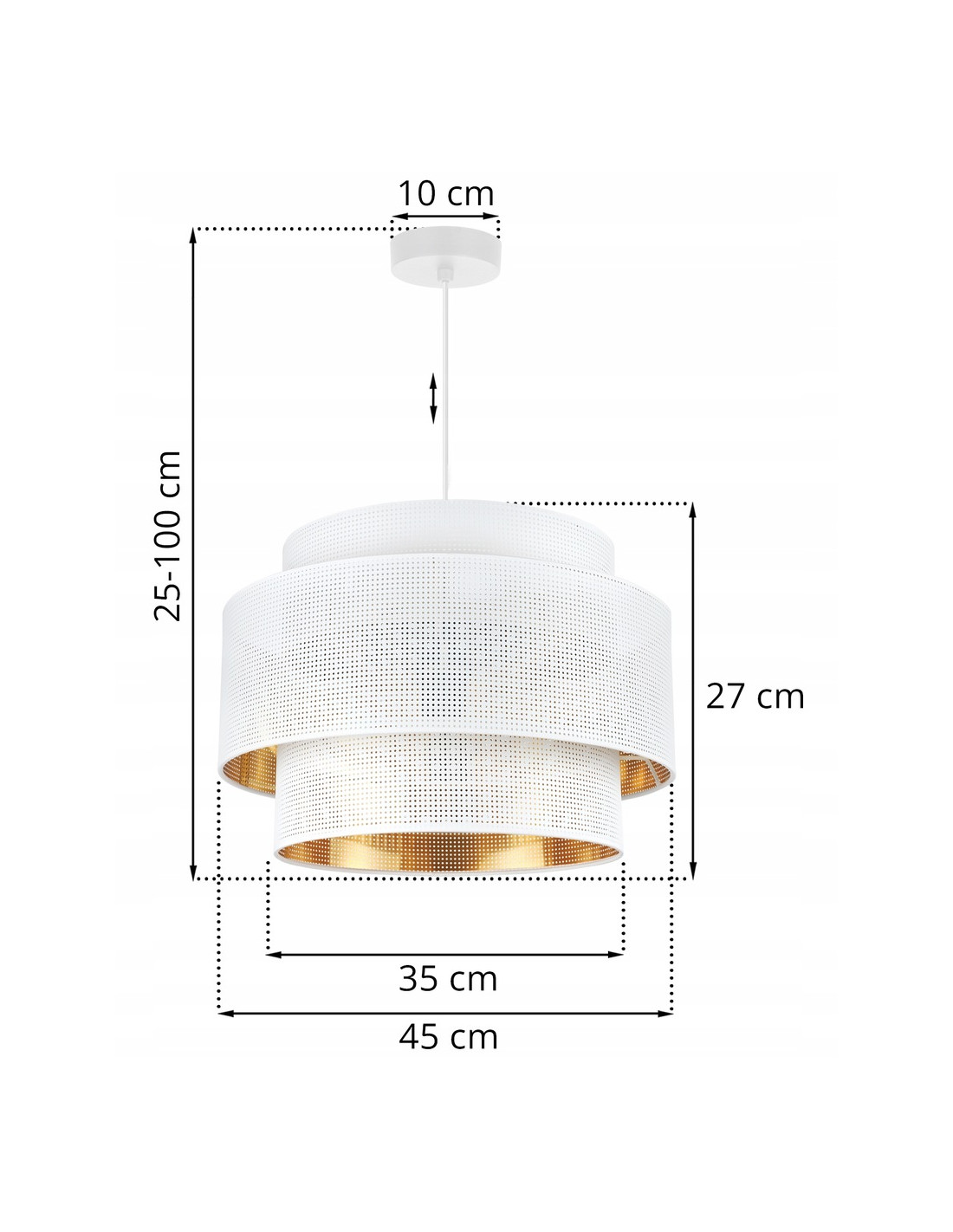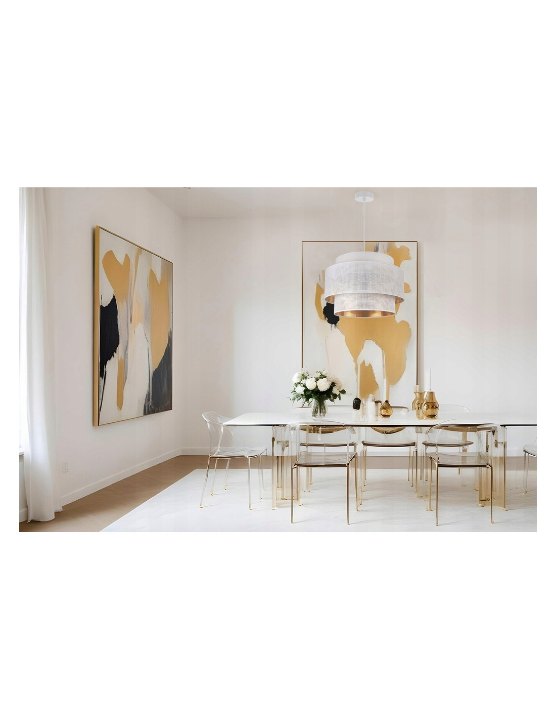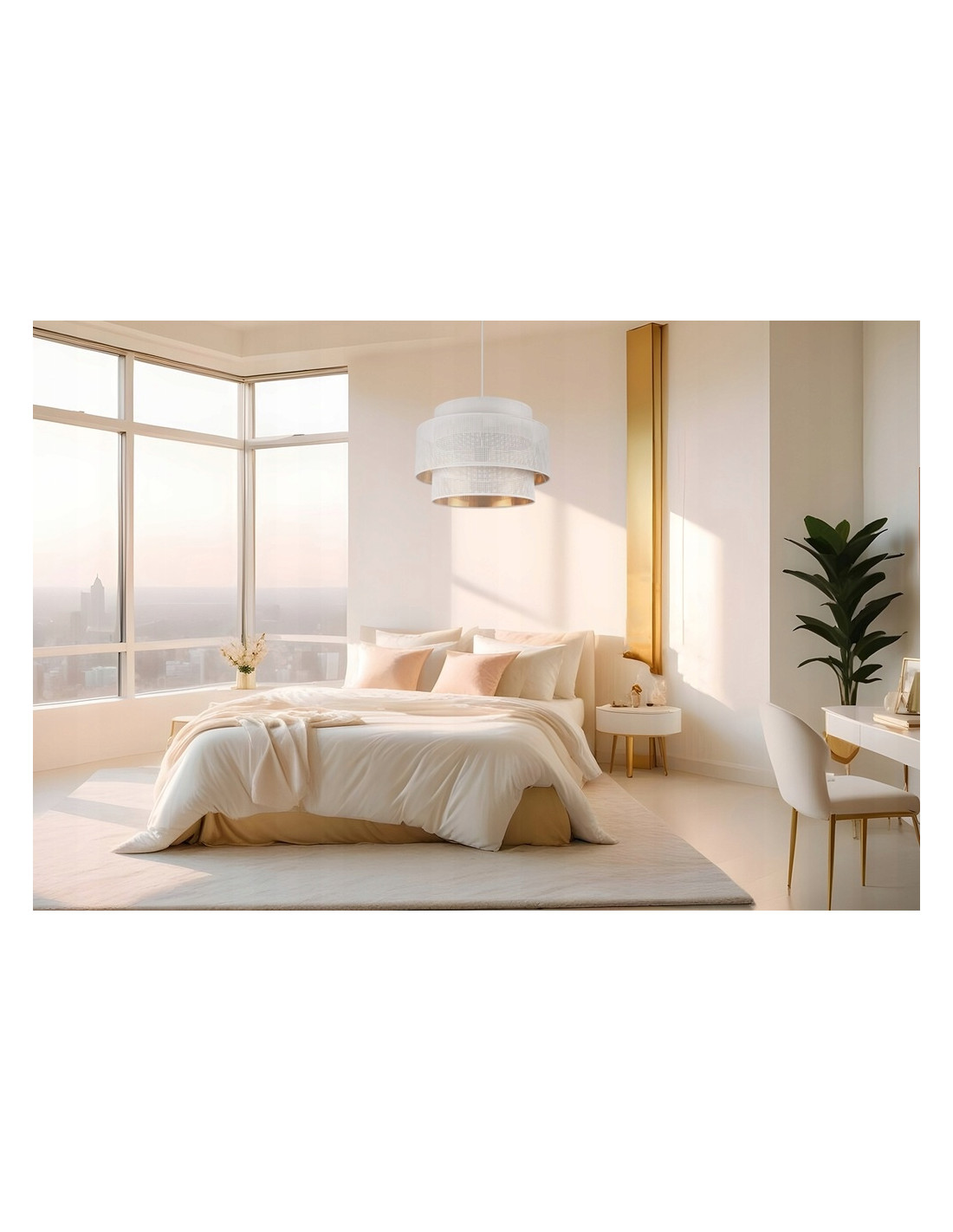 Lampa ASTI charakteryzuje się eleganckim abażurem o średnicy 45 cm, który sprawia, że staje się ona centralnym punktem każdej aranżacji. Połączenie białej tkaniny oraz złotego wnętrza tworzy unikalny efekt glamour, podkreślając urok Twojego salonu, jadalni, czy też innego pomieszczenia.