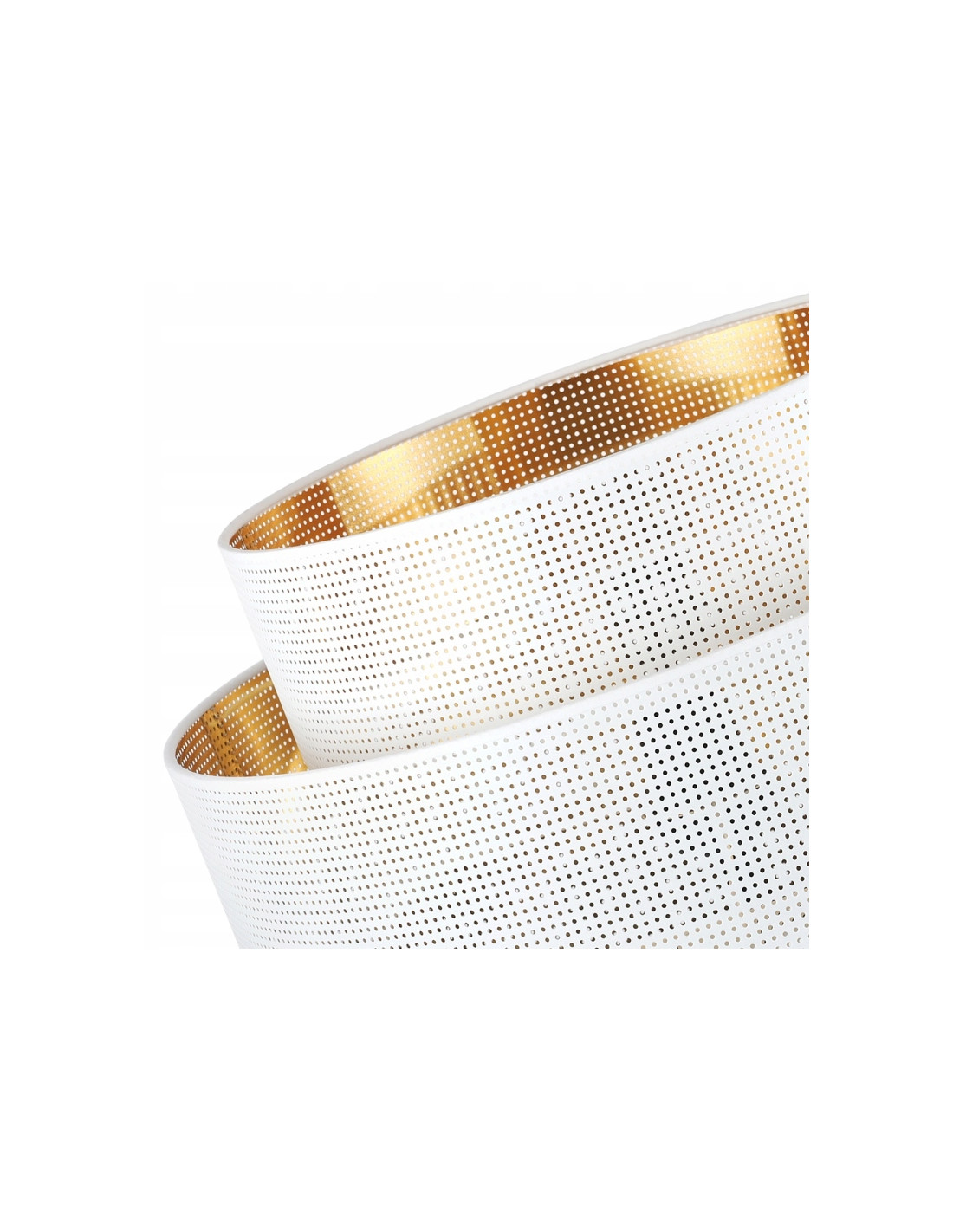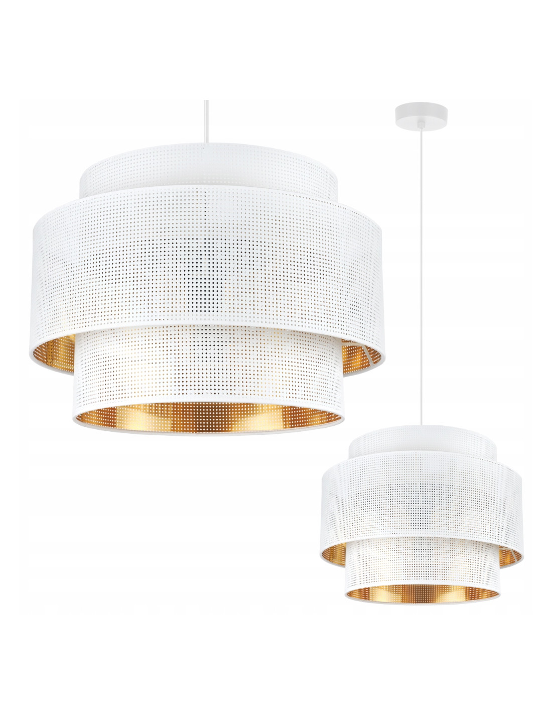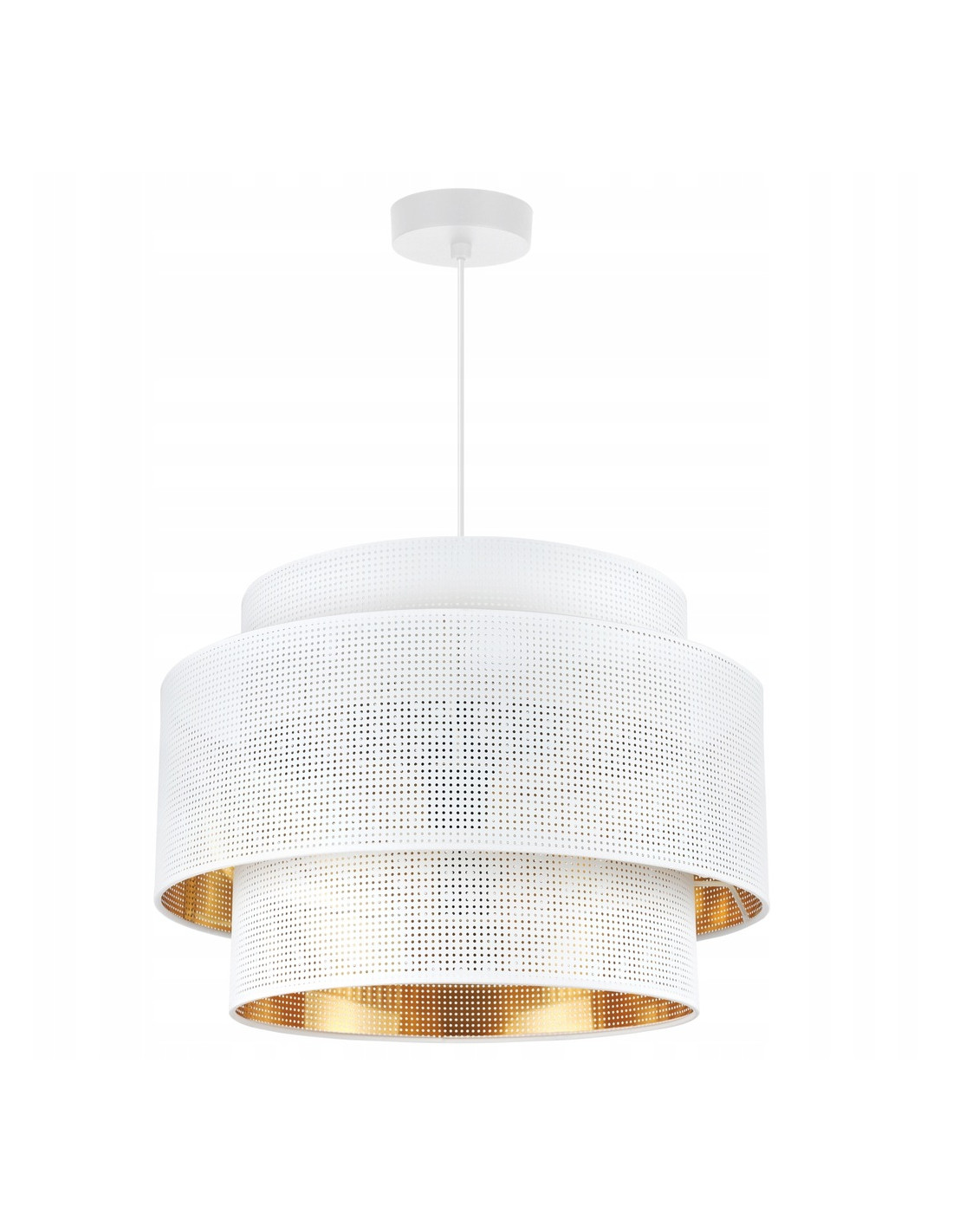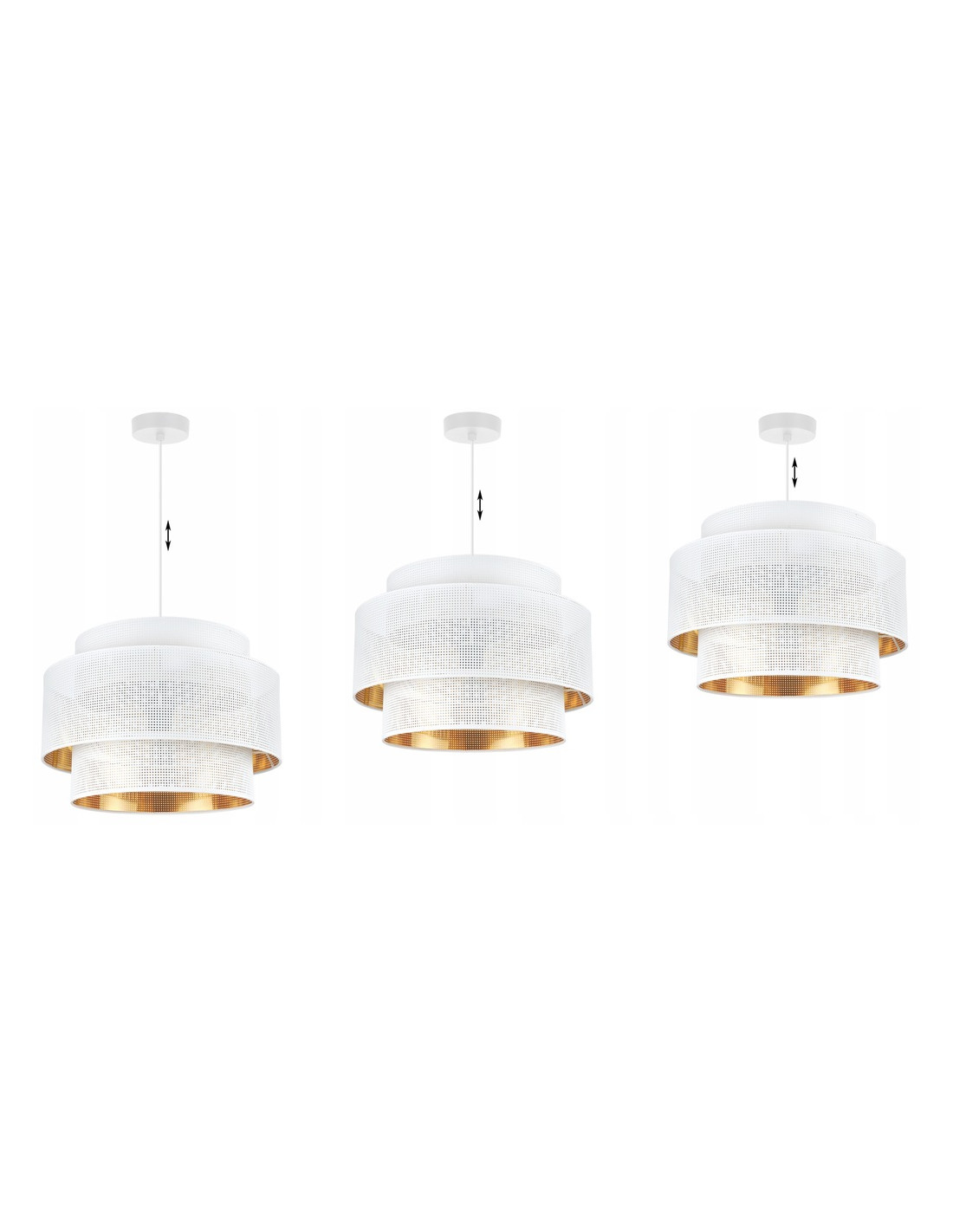 Lampa ASTI charakteryzuje się eleganckim abażurem o średnicy 45 cm, który sprawia, że staje się ona centralnym punktem każdej aranżacji. Połączenie białej tkaniny oraz złotego wnętrza tworzy unikalny efekt glamour, podkreślając urok Twojego salonu, jadalni, czy też innego pomieszczenia.