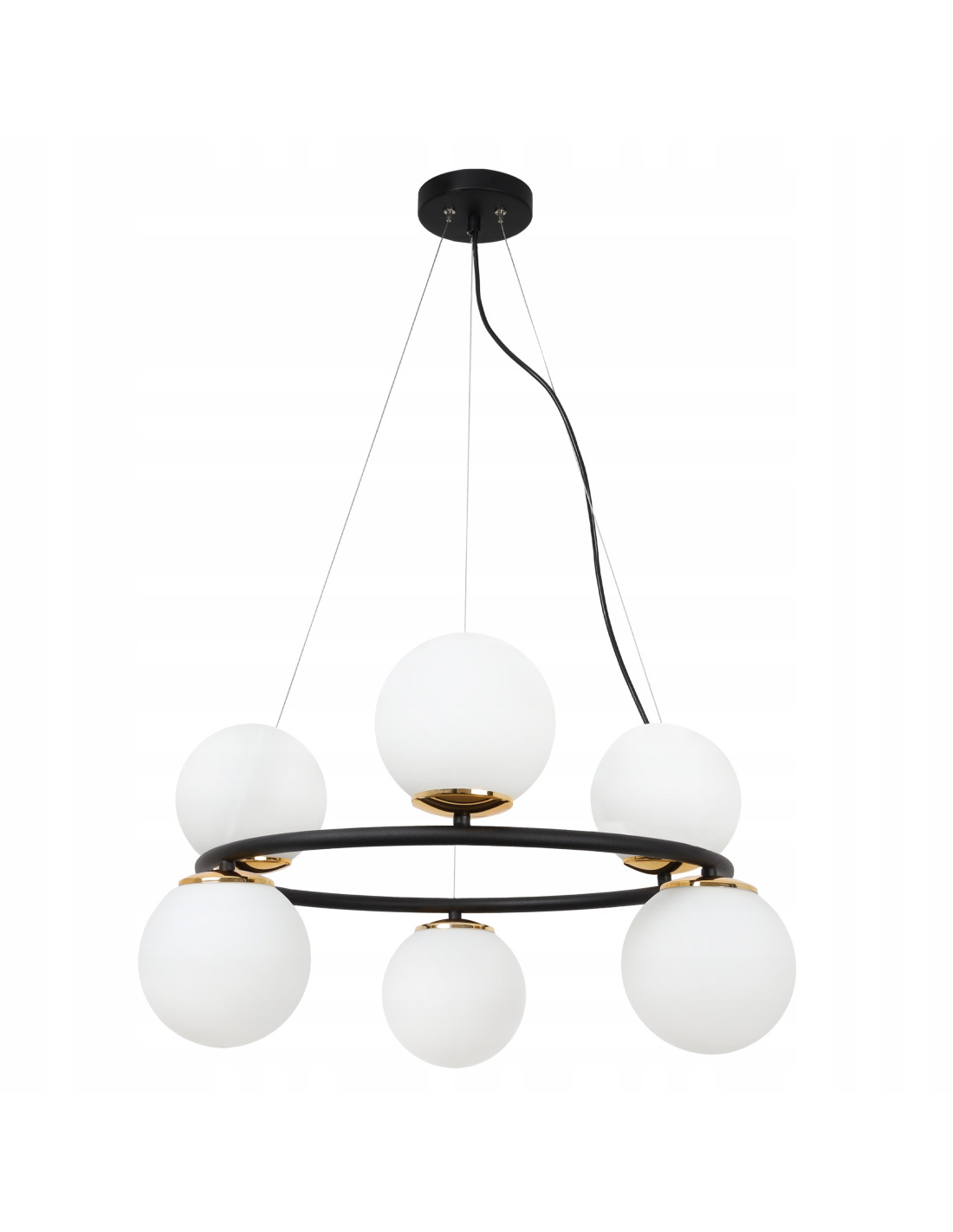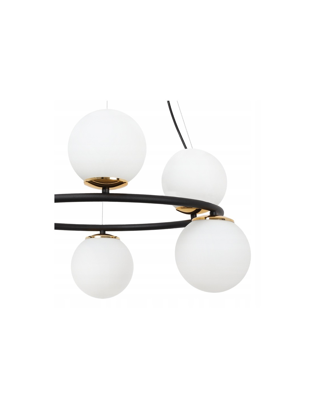 Oświetlenie do kuchni nad wyspę ze złotymi detalami AURA 60W to idealne połączenie elegancji i nowoczesności. Dzięki swojej modnej konstrukcji w kształcie pierścienia oraz sześciu szklanym, białym kloszom, lampa ta wprowadza do wnętrza niepowtarzalny klimat. Czarna listwa ozdobiona złotymi detalami sprawia, że lampa doskonale wpisuje się w stylistykę glamour i nowoczesnych aranżacji.