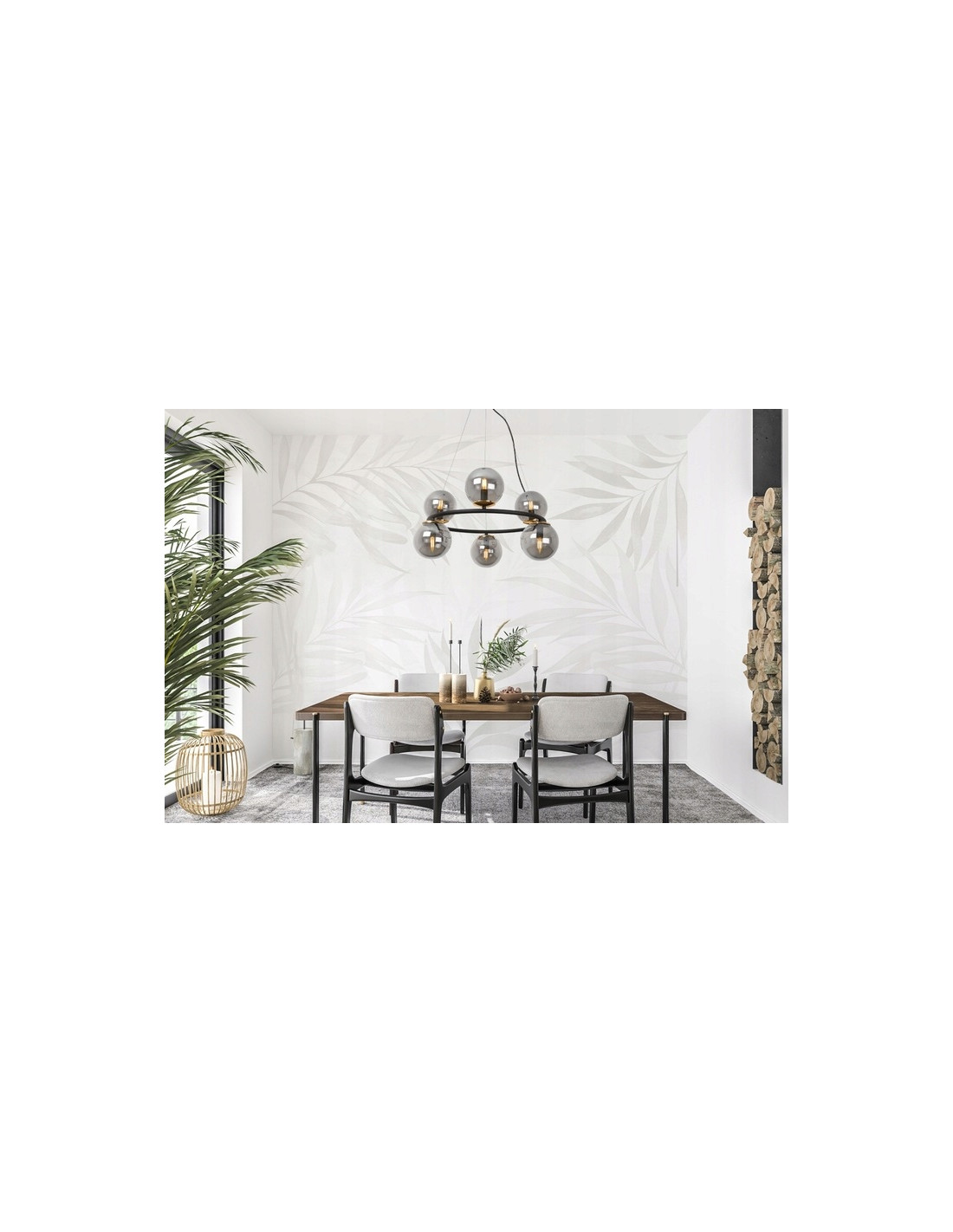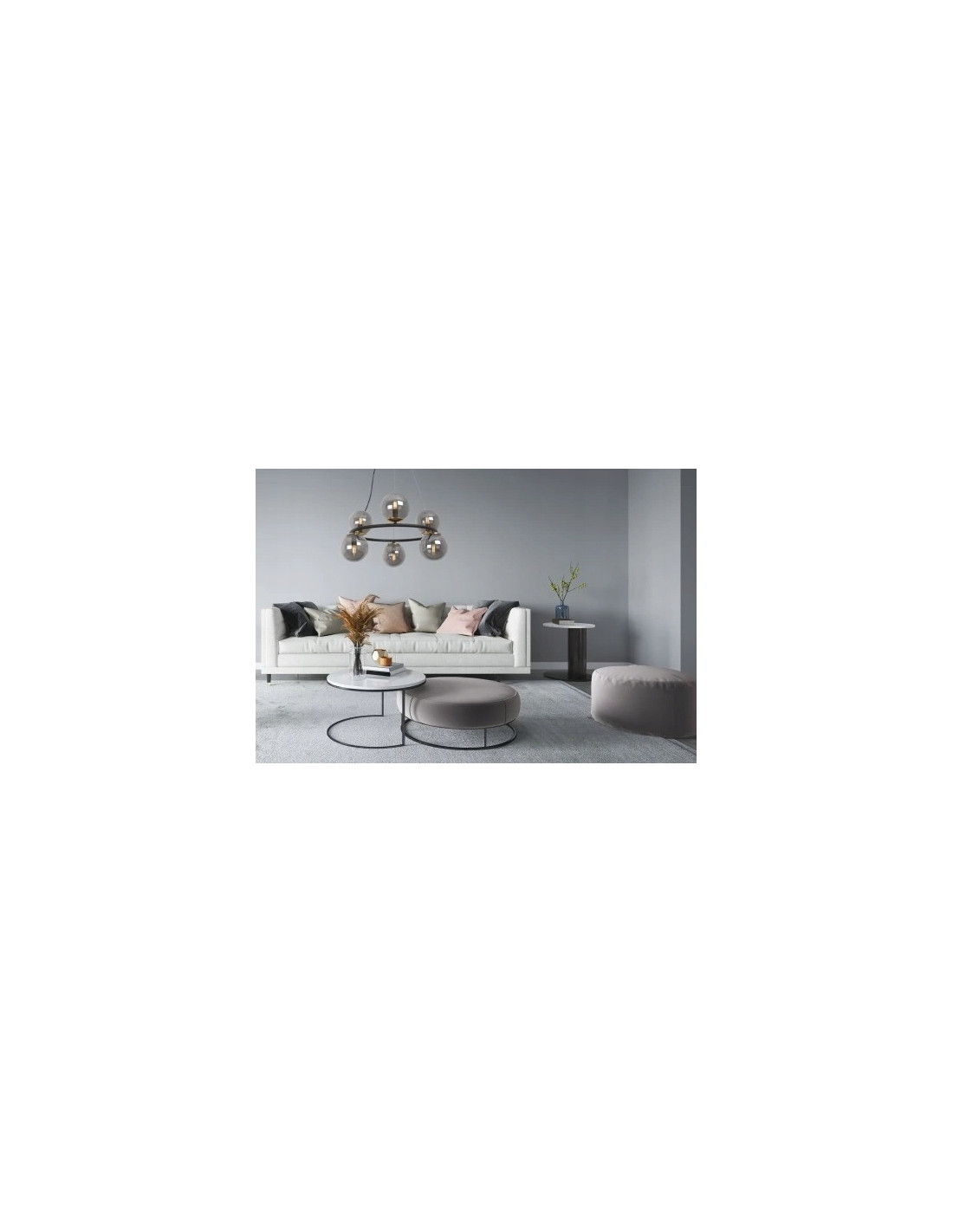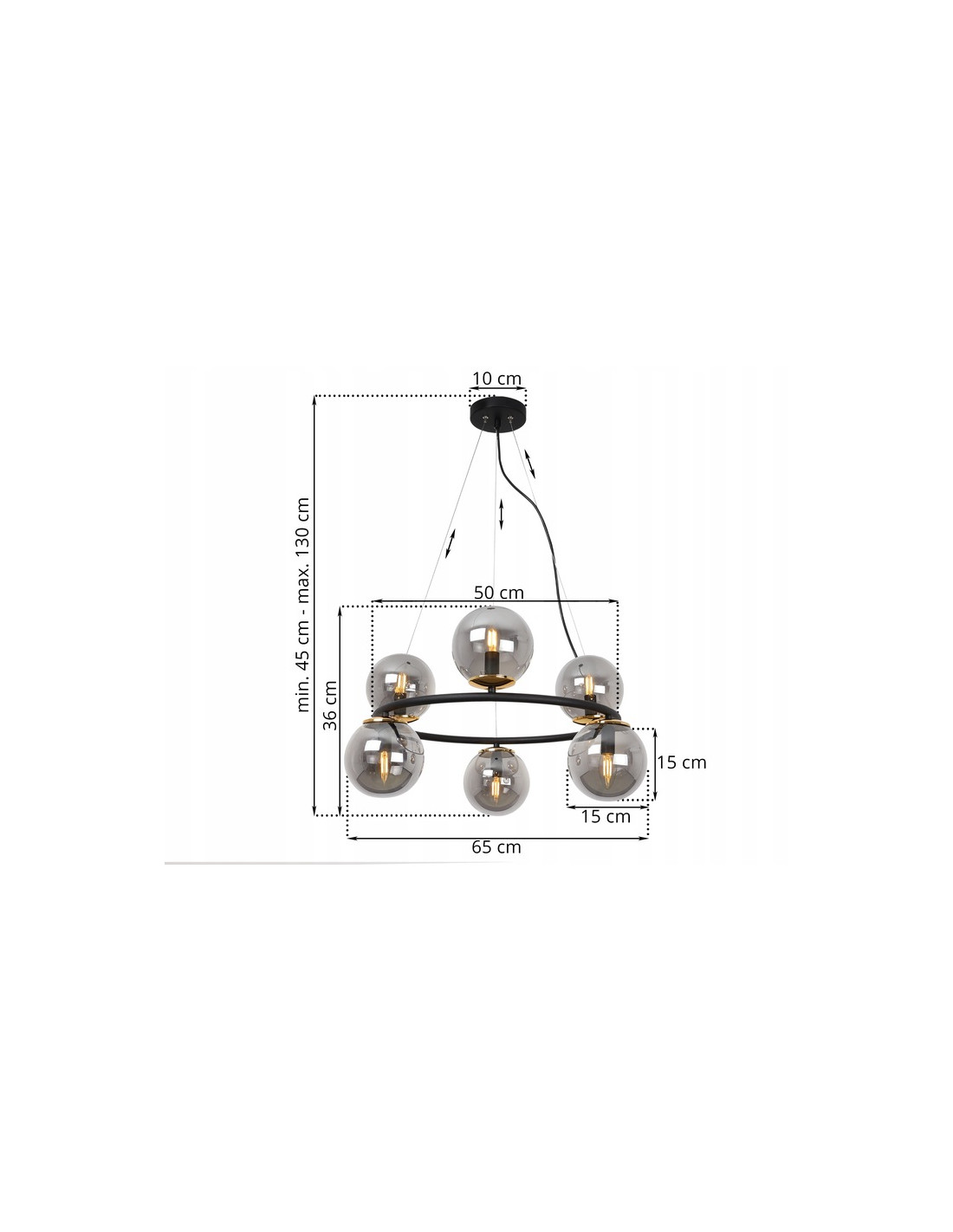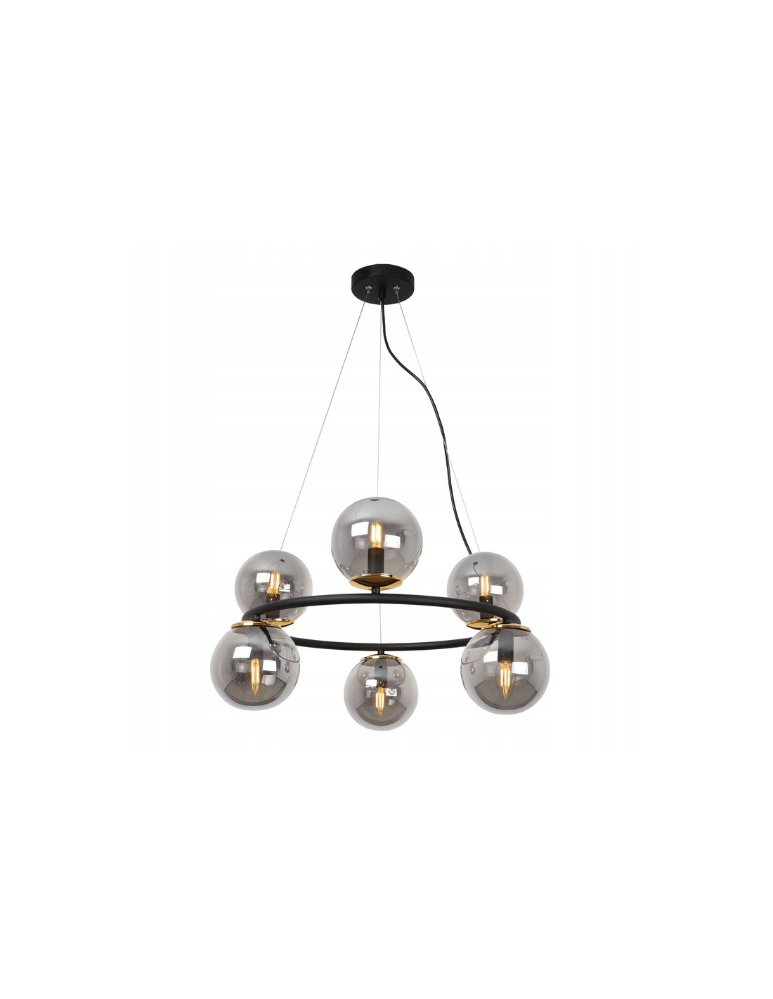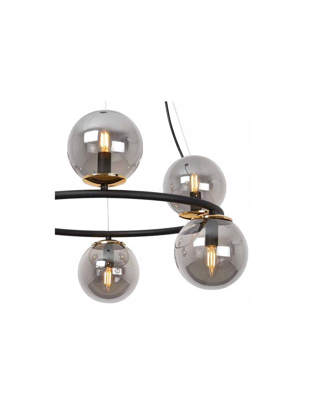 Przedstawiamy Państwu Oświetlenie o kulistych kloszach dookoła pierścienia ze złotą skuwką AURA, doskonałe połączenie nowoczesnego designu z elegancją. Ta wyjątkowa lampa, o średnicy 65 cm, składa się z sześciu szklanych, grafitowych kloszy zawieszonych na czarnej listwie, co tworzy niepowtarzalny efekt wizualny. Idealnie wpisuje się w aranżacje w stylu glamour oraz nowoczesnym, dodając wyjątkowego charakteru każdemu wnętrzu.