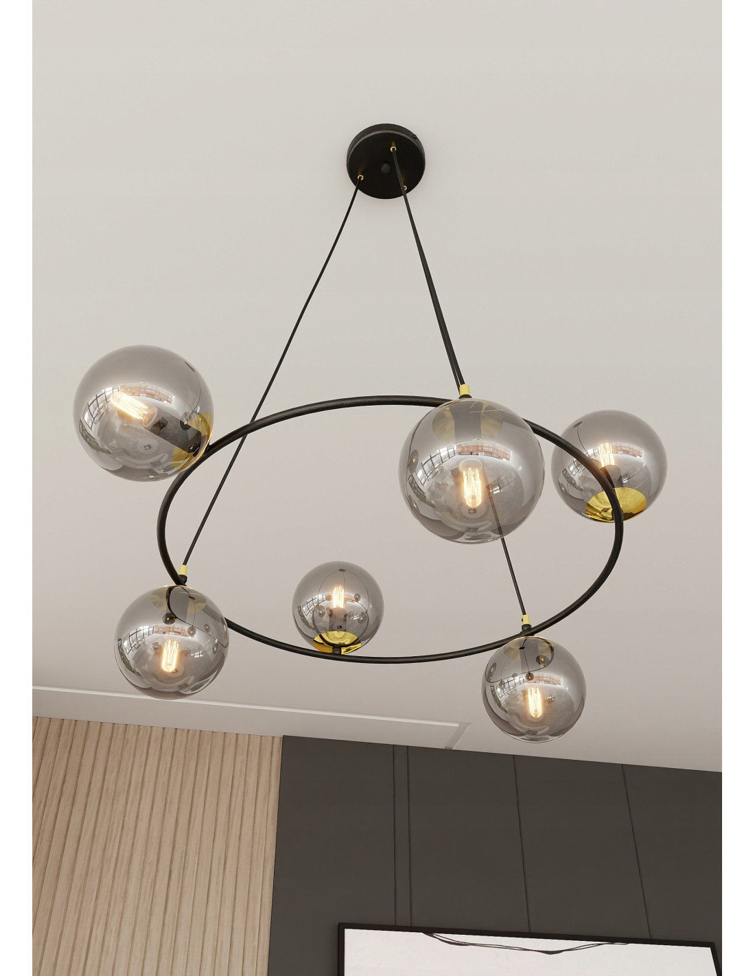 Odkryj lampę wiszącą Azura, która łączy w sobie elegancję i nowoczesność. Jej minimalistyczny design sprawia, że idealnie wpasuje się w różne aranżacje wnętrz, od biura po przestronny salon. Wykonana z wysokiej jakości metalu w eleganckim, czarnym kolorze, lampa prezentuje się niezwykle efektownie w połączeniu z dymionymi kloszami i subtelnymi złotymi akcentami, tworząc harmonijną całość.