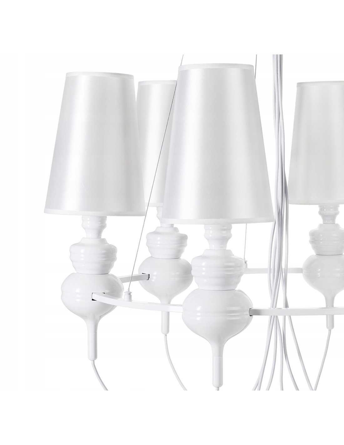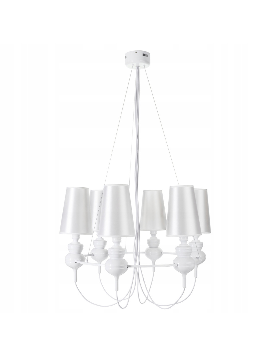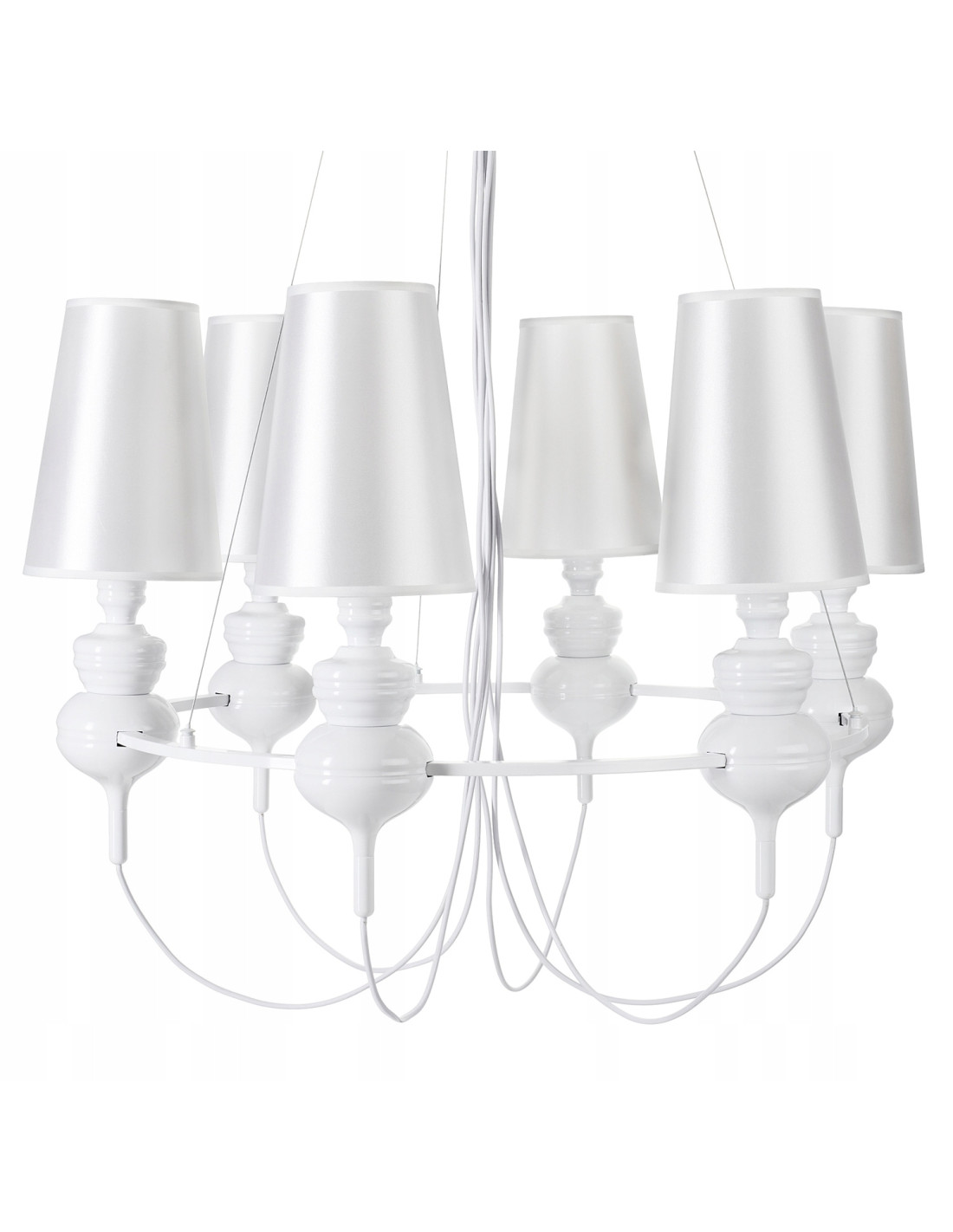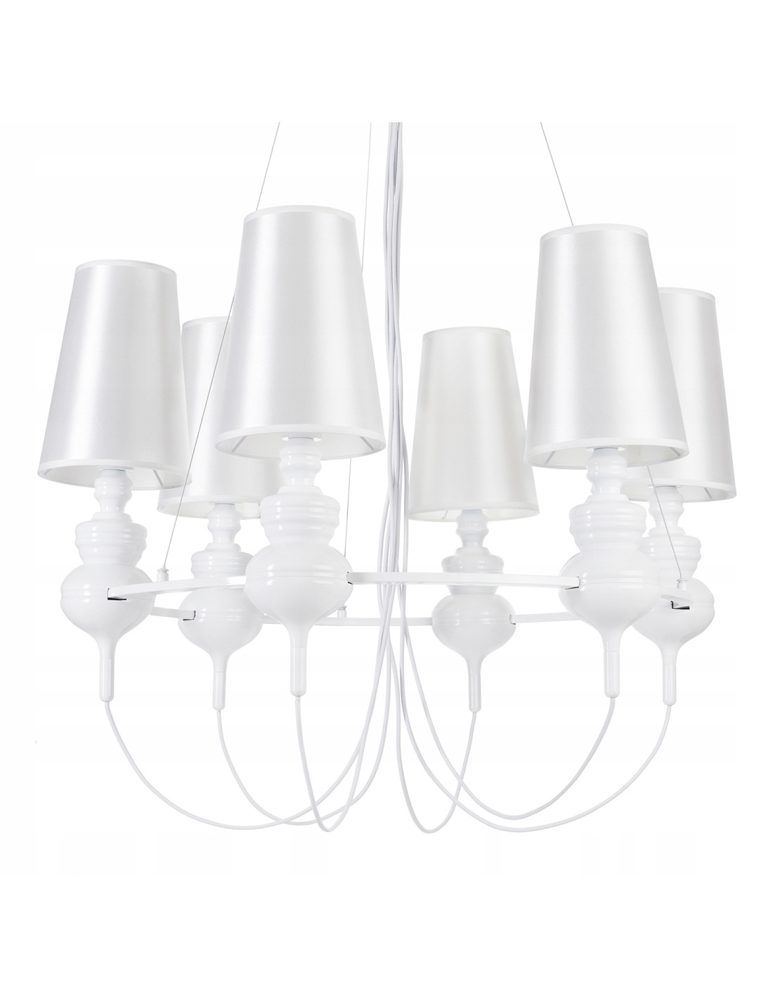 Śnieżnie jasny żyrandol QUEEN-6 to lampa wisząca, która wprowadza elegancję i luksus do każdego wnętrza. Wykonana w stylu glamour, idealnie sprawdzi się jako dekoracyjny element w renomowanych salonach, jadalniach oraz sypialniach. Jej barokowe podstawy w kolorze polerowanej bieli w połączeniu z białymi kloszami tworzą harmonijną całość, która przyciąga wzrok i dodaje szyku.