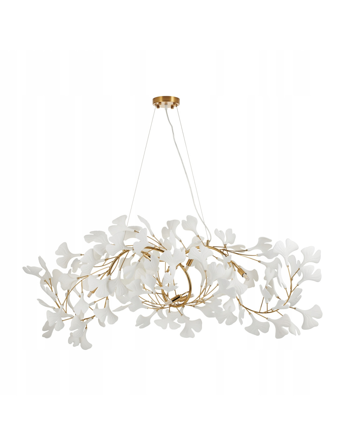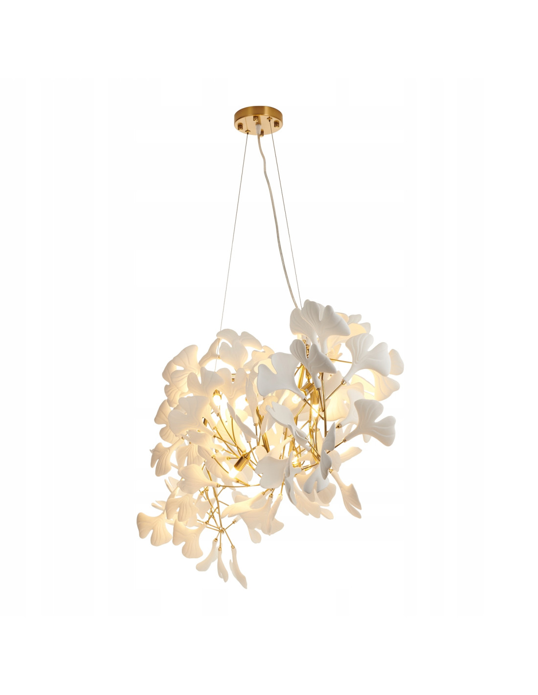 Dzięki metalowemu stelażowi w kolorze polerowanego złota, lampa przyciąga wzrok i dodaje luksusowego charakteru. Na stelażu znajdują się białe ceramiczne liście stylizowane na liście Ginkgo, co sprawia, że jest nie tylko funkcjonalnym źródłem światła, ale również dekoracyjnym elementem wystroju.