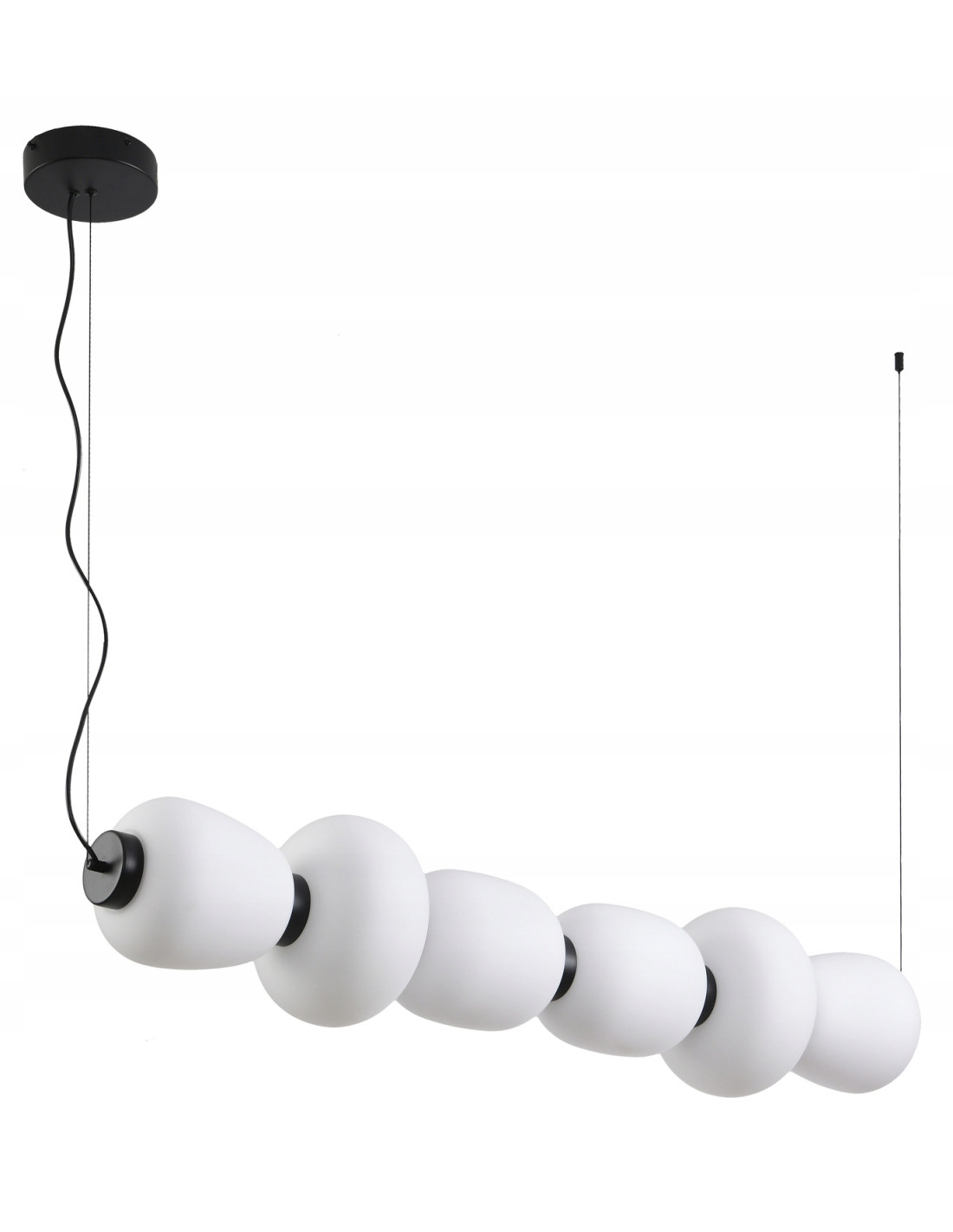 Białe klosze lampy mają satynowe wykończenie, co nadaje im subtelny, a zarazem elegancki wygląd. Lampa BRILLA wyróżnia się asymetryczną okrągłą podsufitką, co sprawia, że staje się doskonałym elementem dekoracyjnym w każdym pomieszczeniu. Dzięki zastosowaniu dużych kloszy w różnych rozmiarach, lampa doskonale komponuje się w różnych aranżacjach wnętrz, od biur, przez jadalnie, po salony.