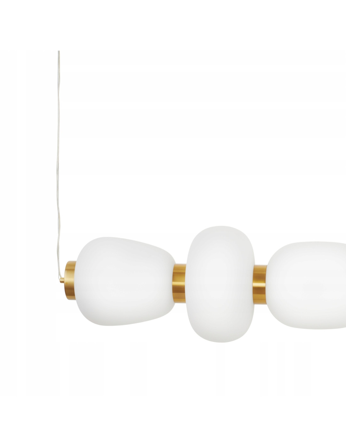 Luksusowa lampa wisząca BRILLA-6 to idealne rozwiązanie dla osób, które pragną wnętrzu nadać elegancki i nowoczesny charakter. Jej unikalny design przypomina poziomo ułożone białe kamienie i składa się z sześciu segmentów o zaokrąglonych, organicznych kształtach. Każdy klosz lampy, wykonany z wysokiej jakości białego szkła, jest oddzielony złotym, metalowym pierścieniem, co dodatkowo podkreśla luksusowy wygląd tej oprawy oświetleniowej.