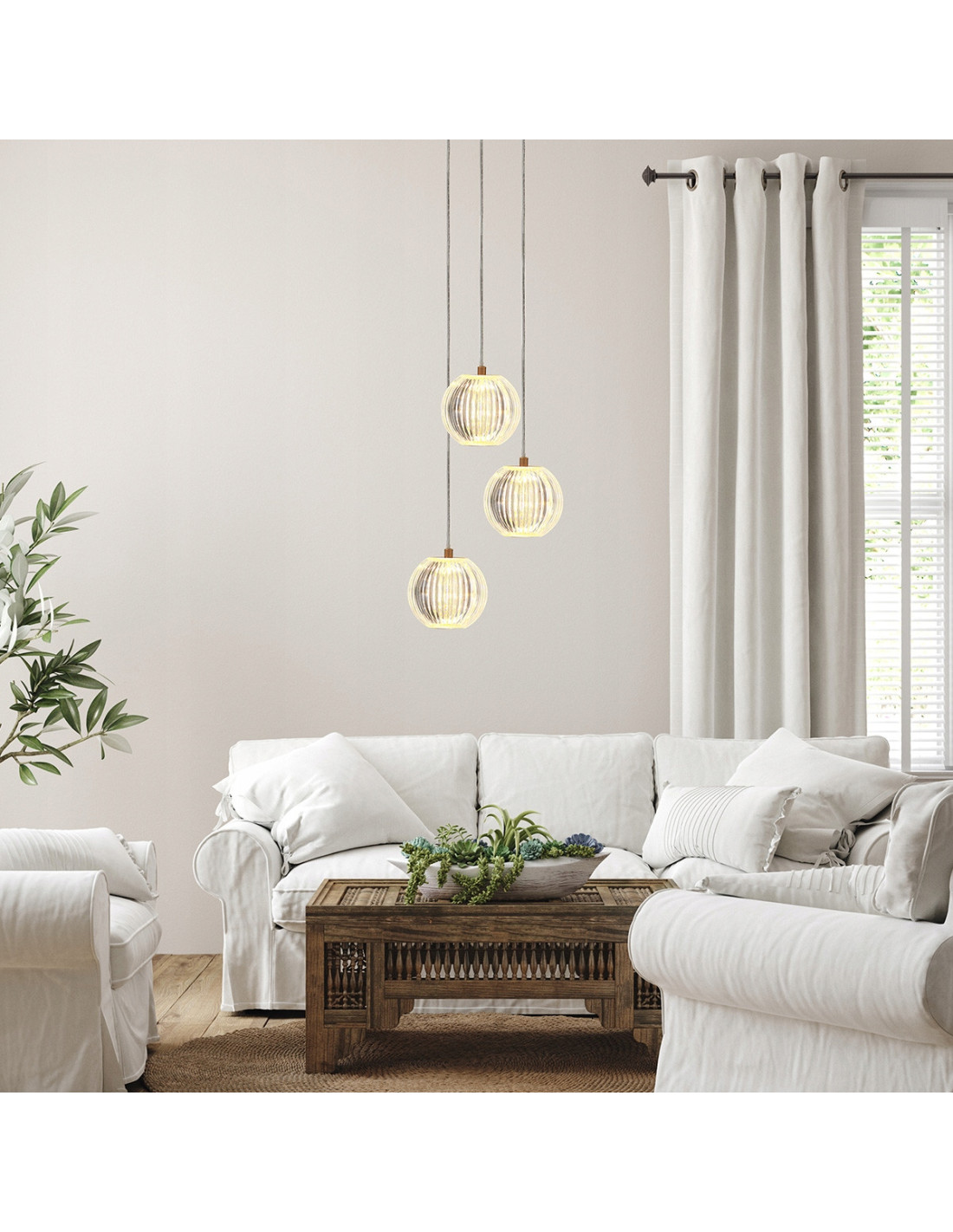 Lampa została starannie wykonana z metalu w szlachetnym złotym kolorze oraz akrylowych kloszy, które posiadają subtelne żłobienia. Całość prezentuje się niezwykle stylowo, a każdy detal lampy został zaprojektowany z myślą o najwyższej jakości. Dodatkowym atutem jest transparentny kabel, który płynnie współgra z całością lampy, dodając jej lekkości.
