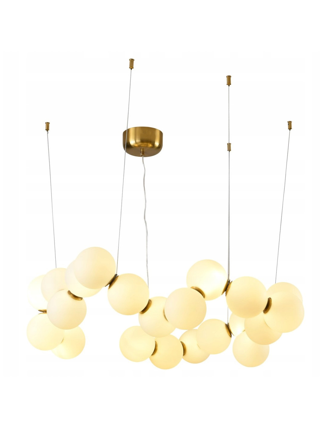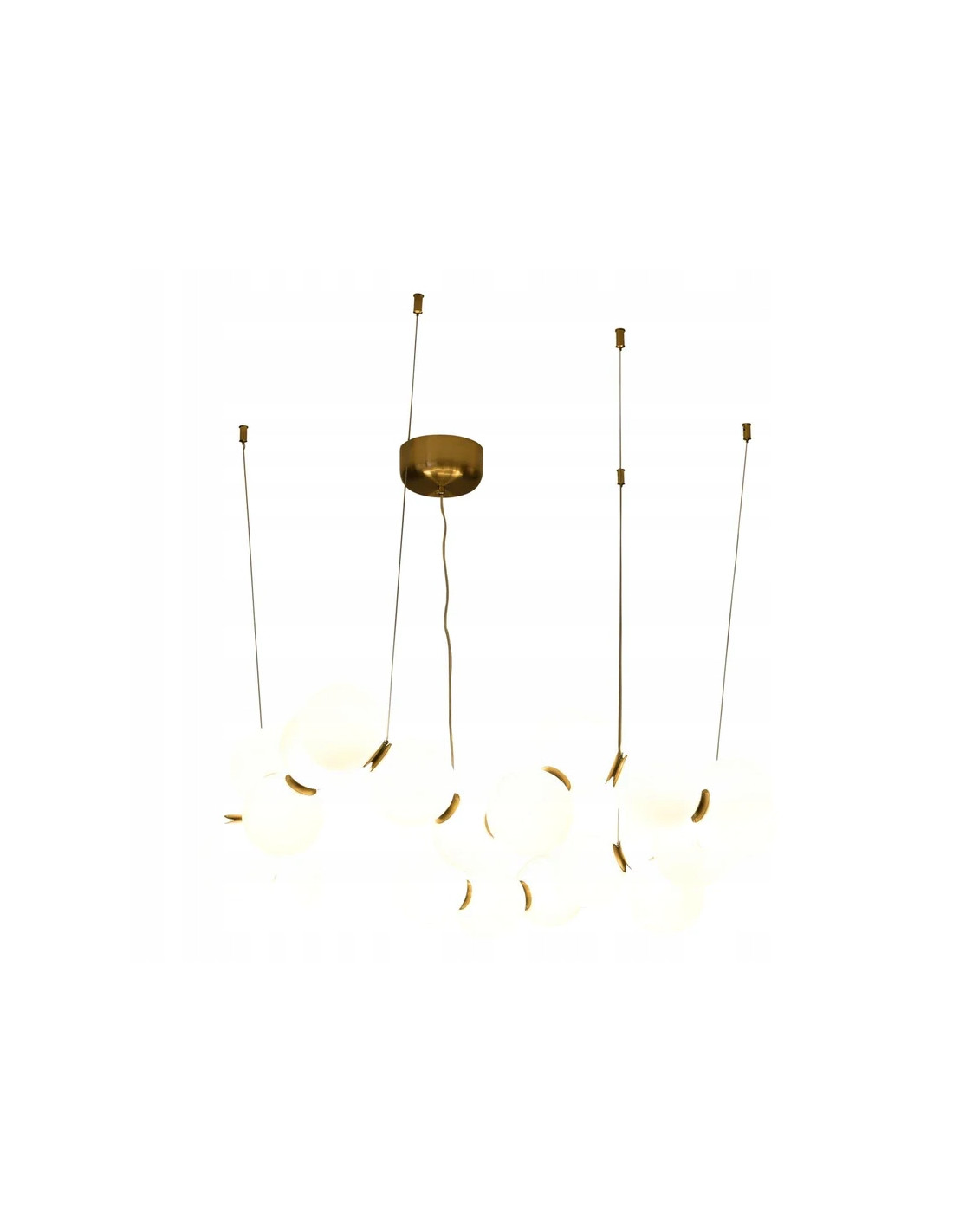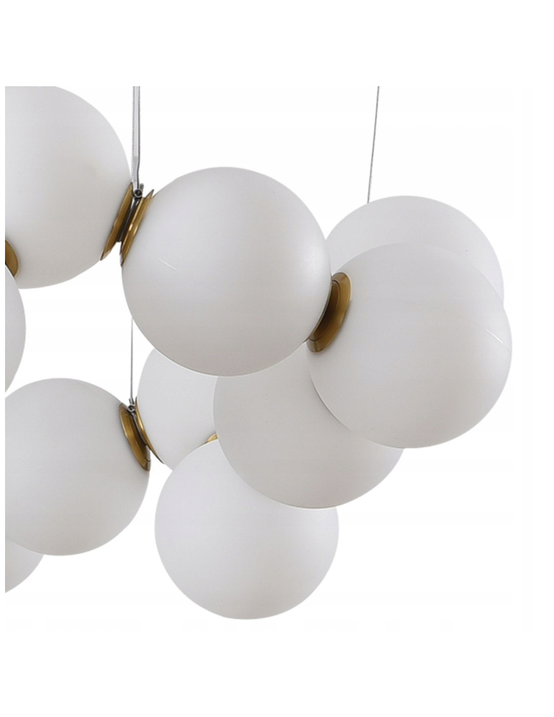 Lampa wisząca CORALLI-80 to połączenie nowoczesnej formy i wysokiej jakości wykończenia, zaprojektowane z myślą o przestrzeniach wymagających eleganckiego, a zarazem dekoracyjnego oświetlenia. Konstrukcja składa się z szeregu białych, mlecznych kloszy ułożonych w nieregularny, okrągły układ, co nadaje lampie lekkości i przypomina współczesną rzeźbę świetlną. Elementy metalowe w kolorze sztucznego mosiądzu oraz subtelne stalowe linki podtrzymujące dodają całości luksusowego charakteru.