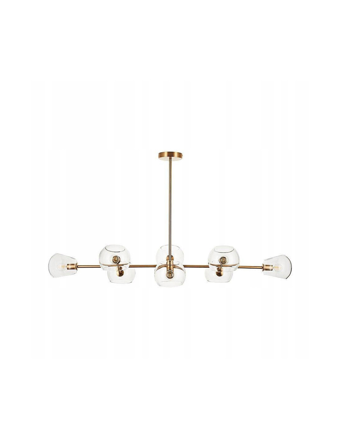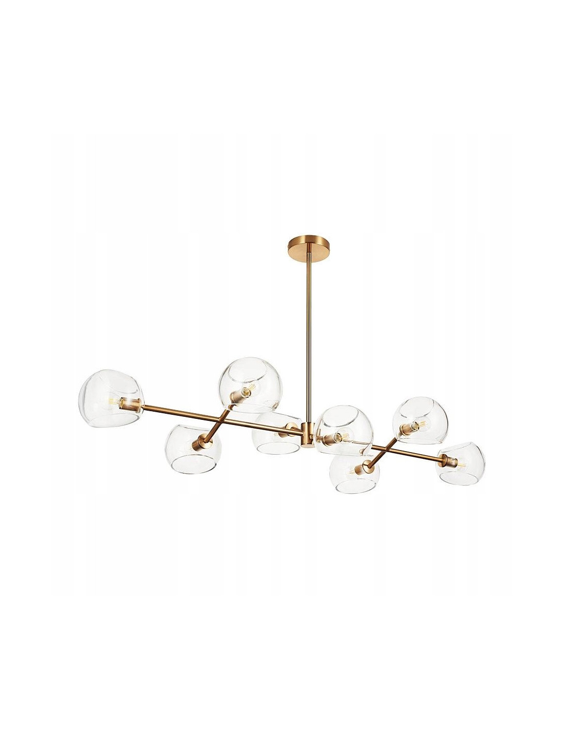 Lampa wisząca COSMIC 8 to eleganckie oświetlenie zaprojektowane z myślą o wnętrzach w stylu Hampton i Art Deco. Wykonana z wysokiej jakości metalu w kolorze złotym oraz ozdobiona transparentnymi kloszami, stanowi efektowny akcent nad stołem, wyspą kuchenną czy w salonie. Model z ośmioma punktami świetlnymi na gwint E14 zapewnia równomierne i wydajne oświetlenie przestrzeni jadalnej lub reprezentacyjnej.