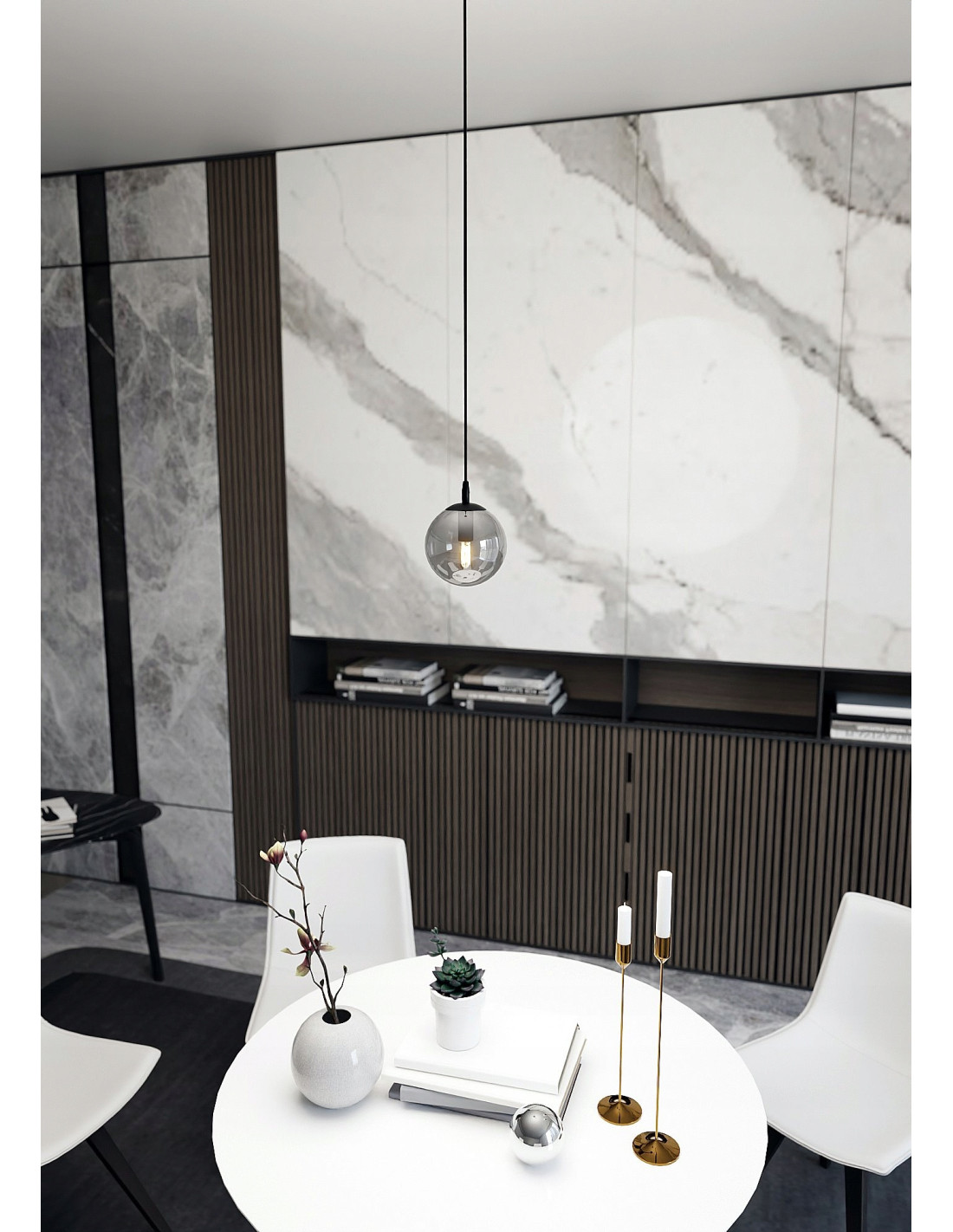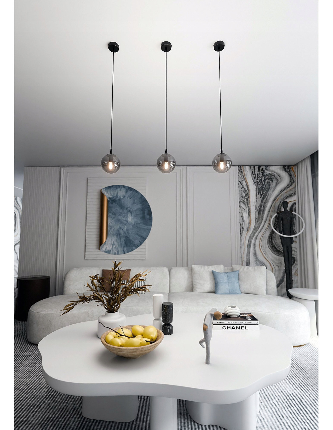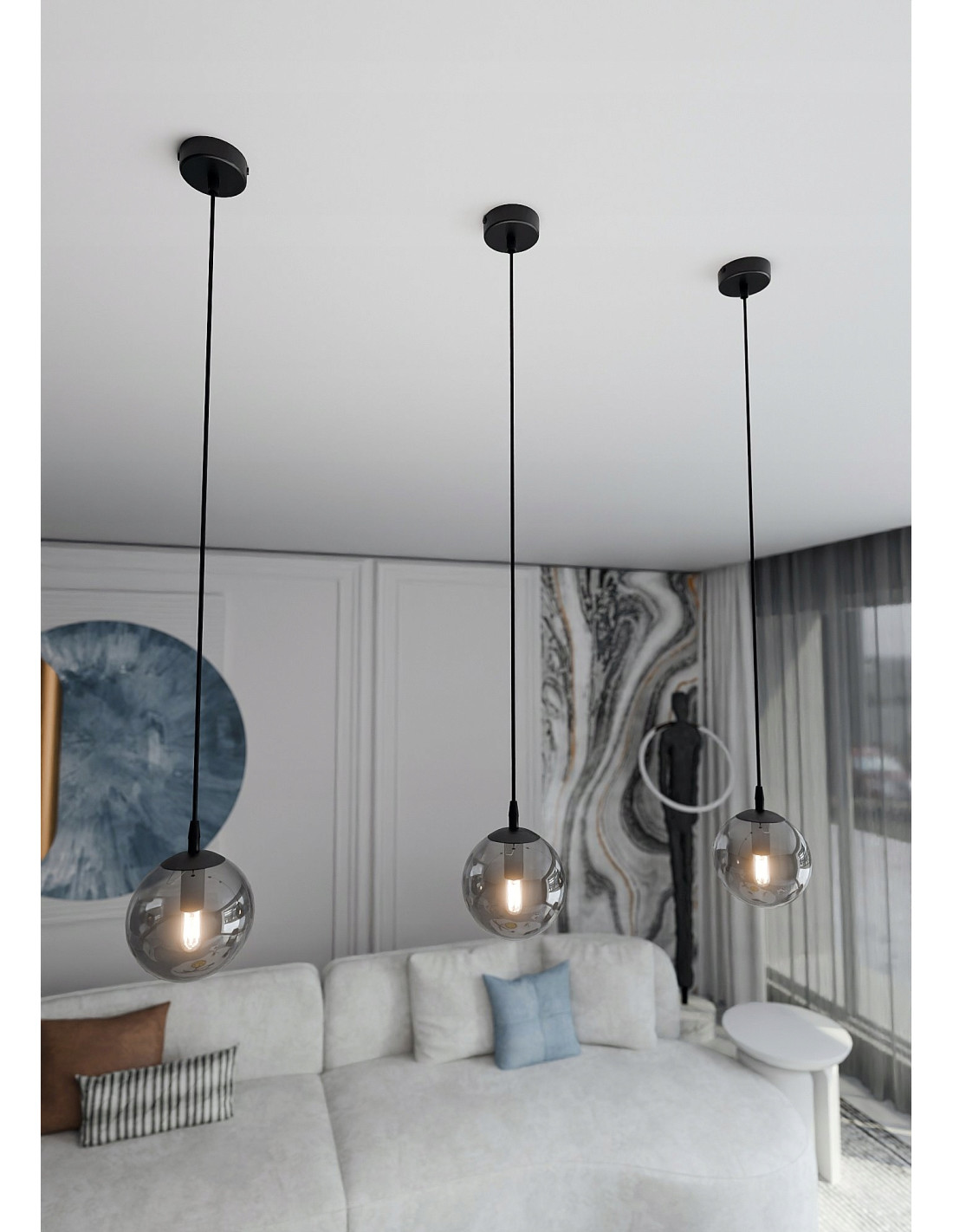 Lampa wyróżnia się okragłą kulą wykonaną z grafitowego szkła, co nie tylko zapewnia stylowy wygląd, ale także doskonałe doświetlenie przestrzeni. Dzięki modnemu, szklanym kloszom, każdy detal został starannie przemyślany, by spełniać zarówno funkcje estetyczne, jak i praktyczne.