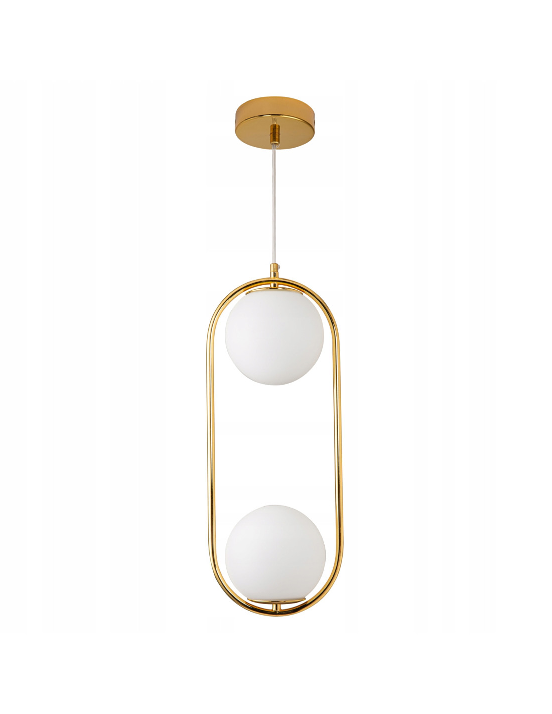 Jednym z najważniejszych atutów lampy jest jej polerowane złoto, które nadaje każdemu pomieszczeniu luksusowy wygląd. Obie klosze wykonane z mlecznego szkła bukładiują równomierne światło, tworząc przytulną atmosferę. Dodatkowo, unikalny kształt ramy w stylu fryzjerki przyciąga wzrok i stanowi doskonały element dekoracyjny.