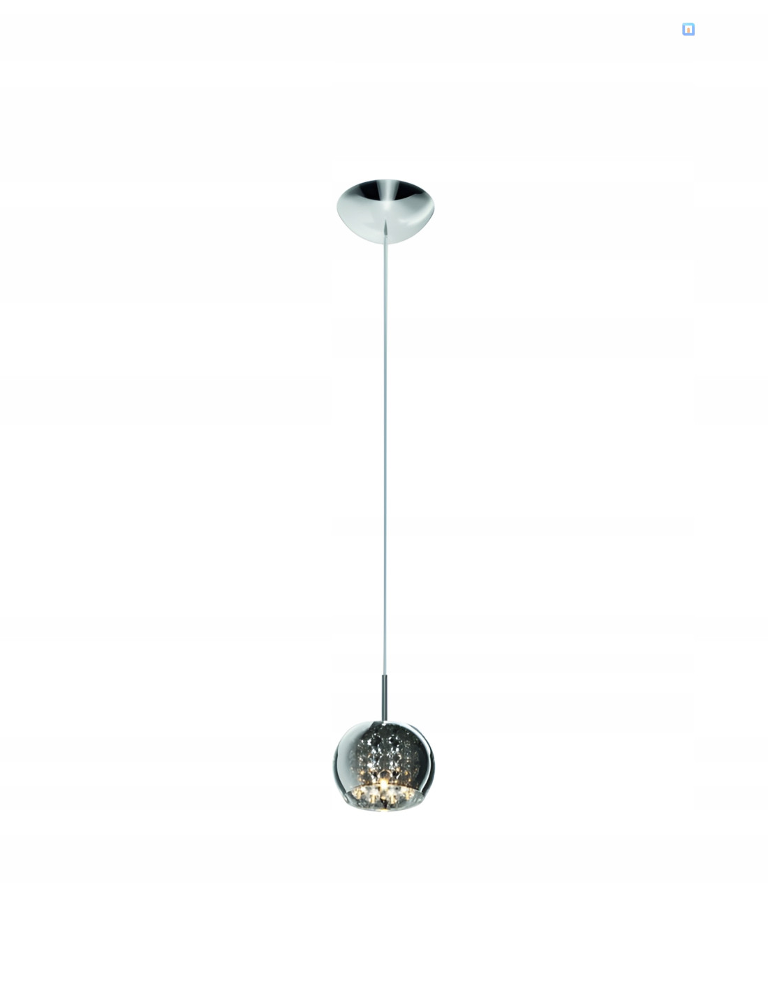 Klosz lampy wykonany jest z przydymionego szkła, co nadaje mu subtelności i lekkości. Zaokrąglony kształt doskonale wkomponowuje się w nowoczesne przestrzenie, a jego transparentne wykończenie sprawia, że lampa nie przytłacza otoczenia. We wnętrzu lampy znajdują się dekoracyjne elementy przypominające kryształowe krople, które zawieszone są na różnych wysokościach, tworząc efektowną grę świateł.