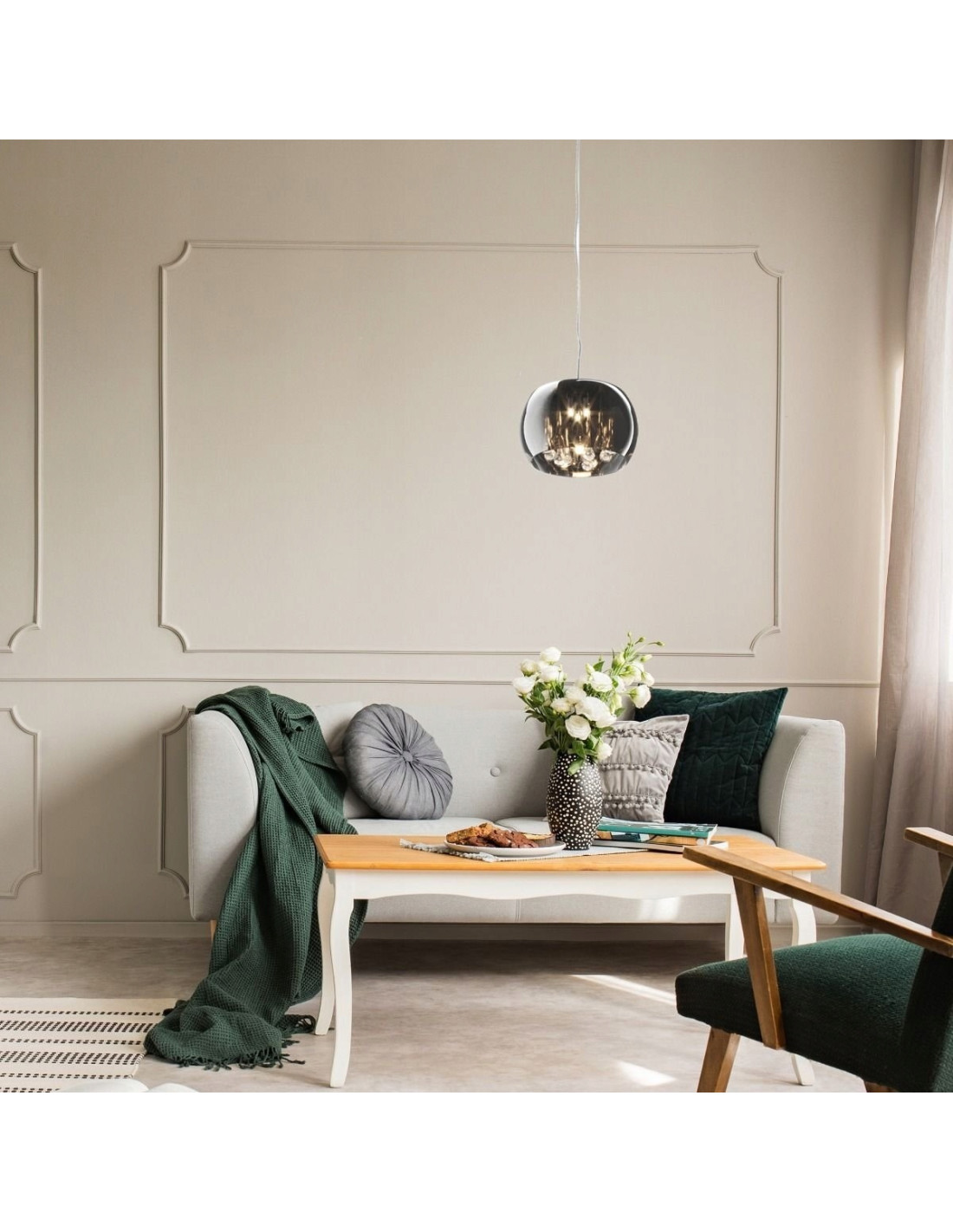 Klosz lampy ma zaokrąglony kształt i jest wykonany z przydymionego szkła, co dodaje jej subtelności i elegancji. Wewnątrz klosza znajdują się dekoracyjne elementy w postaci kryształowych kropli, które rozpraszają światło i tworzą magiczny klimat. Dzięki temu, lampa doskonale sprawdza się jako oświetlenie główne, jak i nastrojowe.