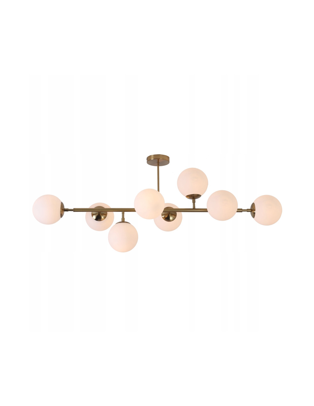 Żyrandol poprzeczny DORADO to wyjątkowy element oświetleniowy, który z pewnością przyciągnie wzrok w każdym wnętrzu. Dzięki asymetrycznym mlecznym kulom oraz eleganckiemu złotemu stelażowi, lampa nie tylko pełni funkcję użytkową, ale również stanowi piękną dekorację. Wyróżnia się ona dużą liczbą kloszy – 8 szklanymi kulami – co znacząco wpływa na jakość oświetlenia, czyniąc ją doskonałym wyborem do salonów, jadalni, czy biur.