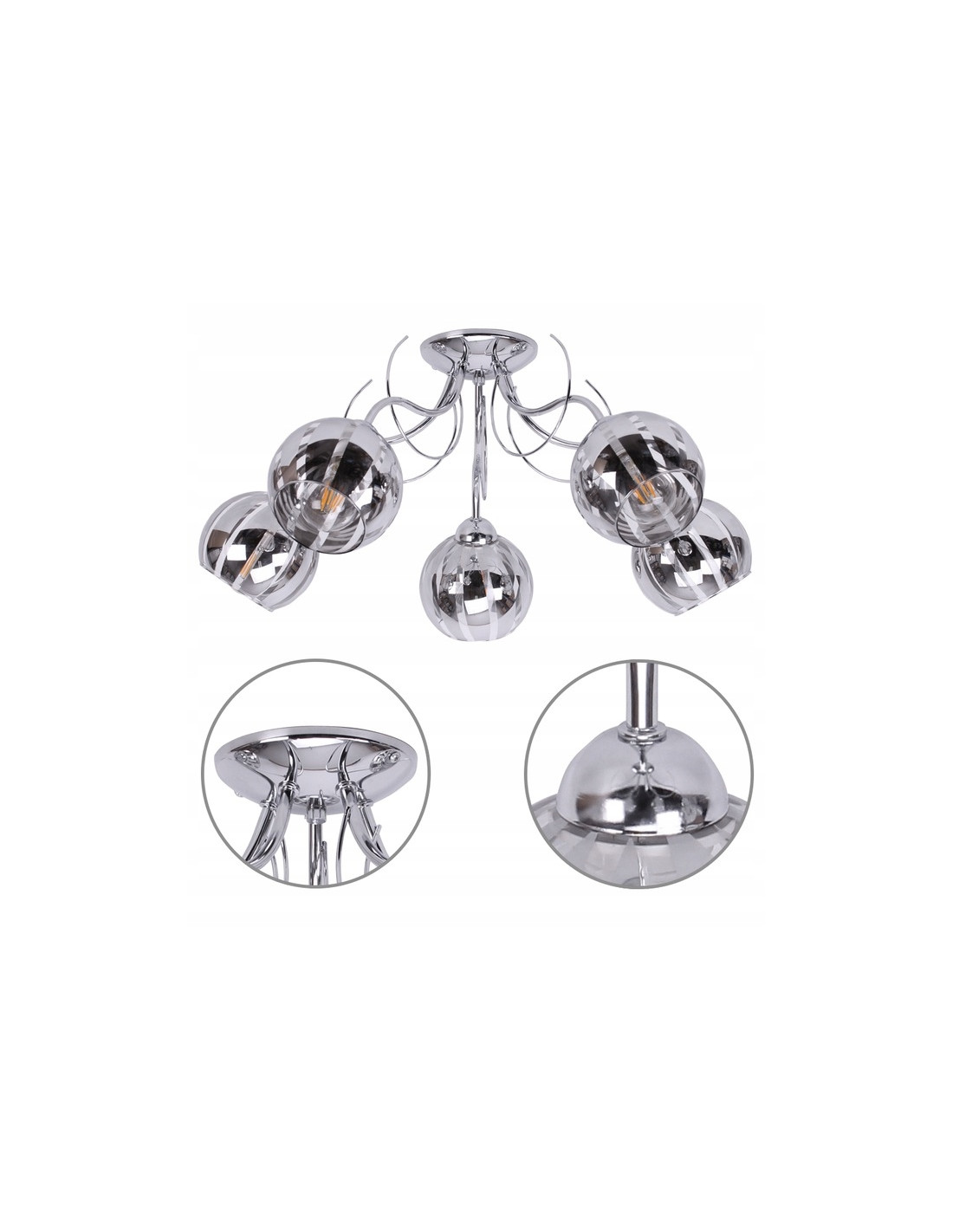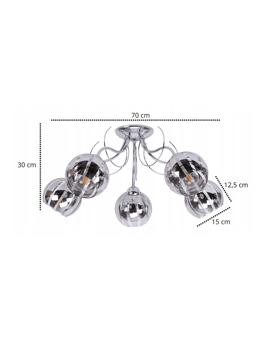 Eliza charakteryzuje się oryginalnymi kloszami wykonanymi ze szkła, które ozdobione są chromowanymi paskami. Ten designerski efekt nadaje lampie unikalnego charakteru, który przyciąga wzrok i sprawia, że staje się centralnym punktem pomieszczenia. Warto podkreślić, że wysokość lampy wynosi 30 cm, a szerokość to 70 cm, co sprawia, że idealnie wpasuje się w różnorodne aranżacje.