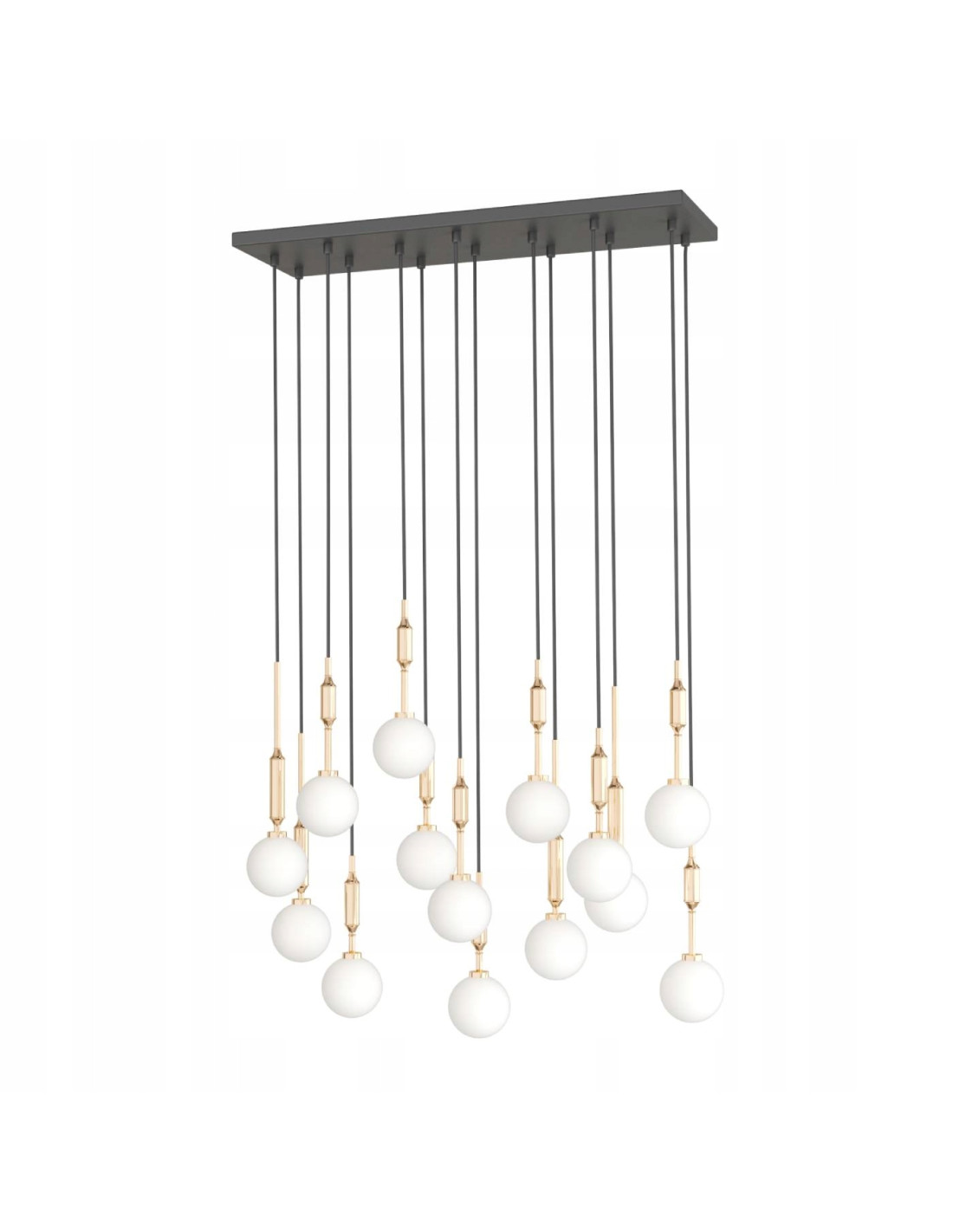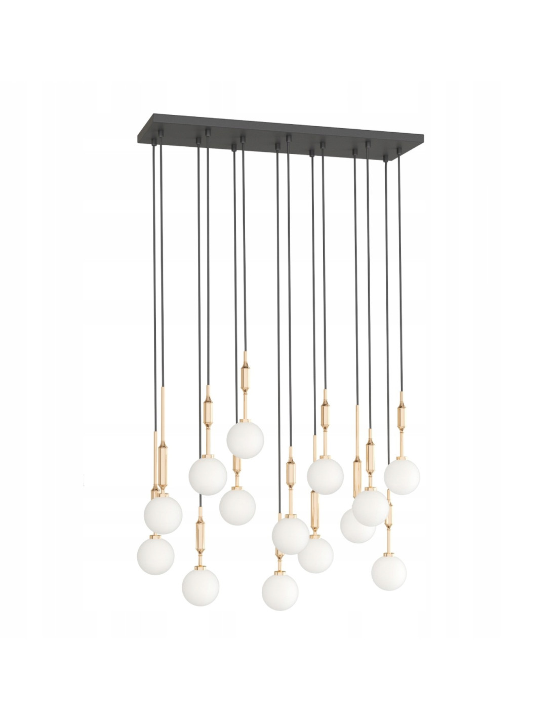 W konstrukcji lampy zastosowano czternaście mlecznych kul, które są zawieszone na smukłych, czarnych przewodach. Taka kompozycja tworzy efektowną i przestrzenną formę, która doskonale sprawdzi się w takich miejscach jak:
