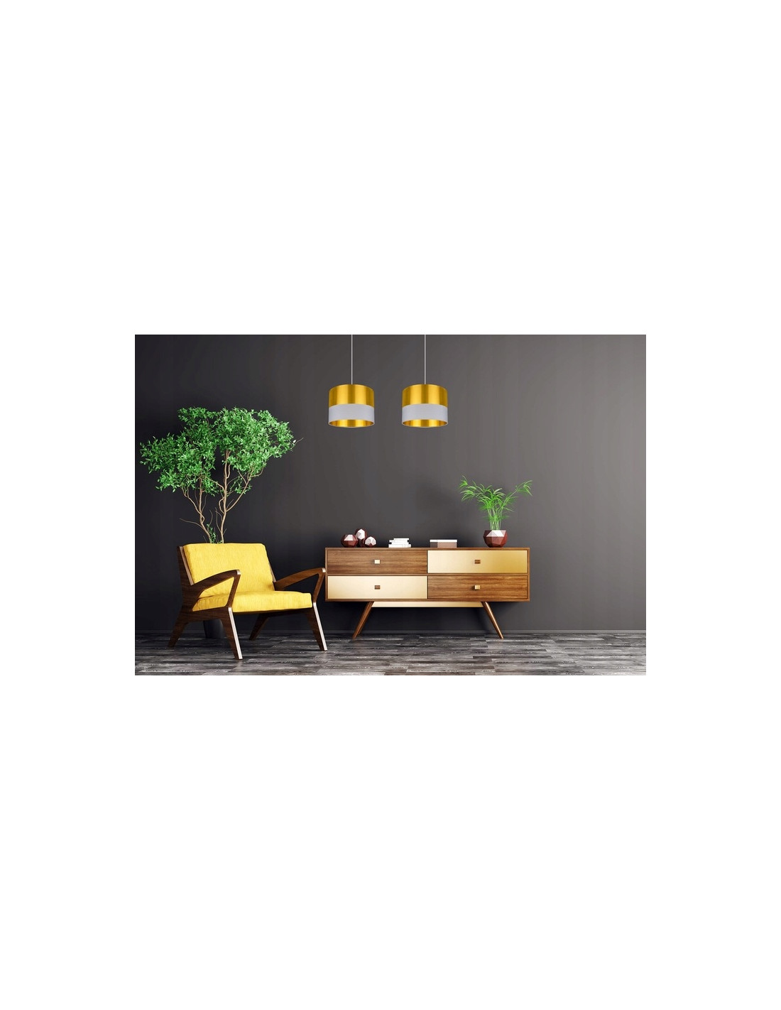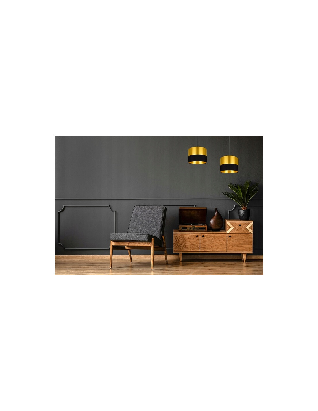Ekskluzywny zwis z dekoracyjnym czarnym paskiem na końcu klosza GOLDEN 60W to doskonały wybór dla tych, którzy pragną wprowadzić do swojego wnętrza niepowtarzalny styl i elegancję. Ta nowoczesna lampa wisząca, wykonana w wyrafinowanej kolorystyce złoto-czarnej, z pewnością stanie się głównym punktem każdego pomieszczenia, w którym ją umieścisz. Niezależnie od tego czy to kuchnia, salon, biuro, czy jadalnia, ta lampa doda uroku i ciepła Twoim przestrzeniom.