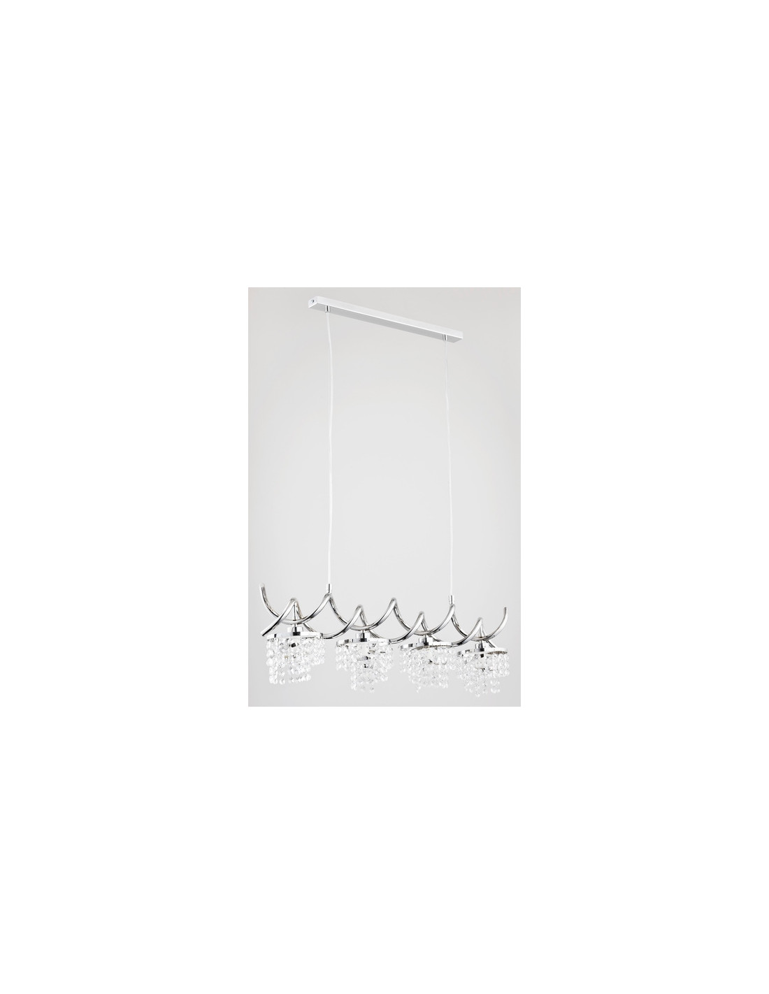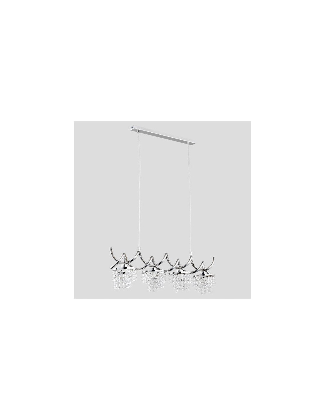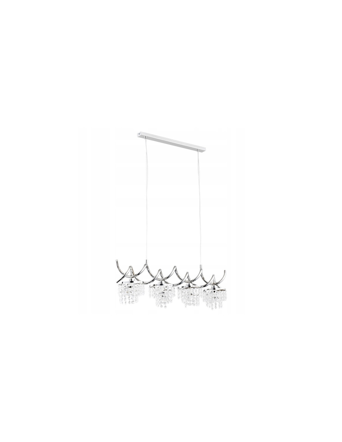 Stelaż lampy wykonany z trwałego metalu zapewnia stabilność, a zwisające kryształki rozpraszają światło, tworząc przyjemną, ciepłą atmosferę w każdym miejscu. Lampa jest przeznaczona na cztery żarówki E14 (nie dołączone do zakupu), co pozwala na dostosowanie poziomu oświetlenia do indywidualnych potrzeb i preferencji użytkowników.