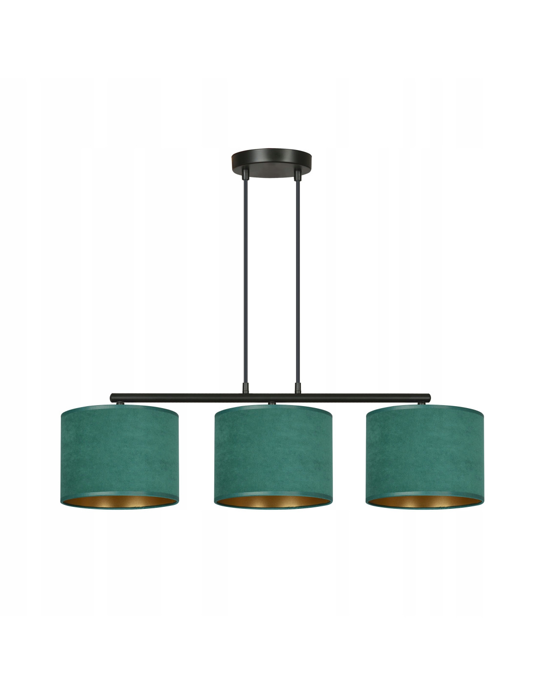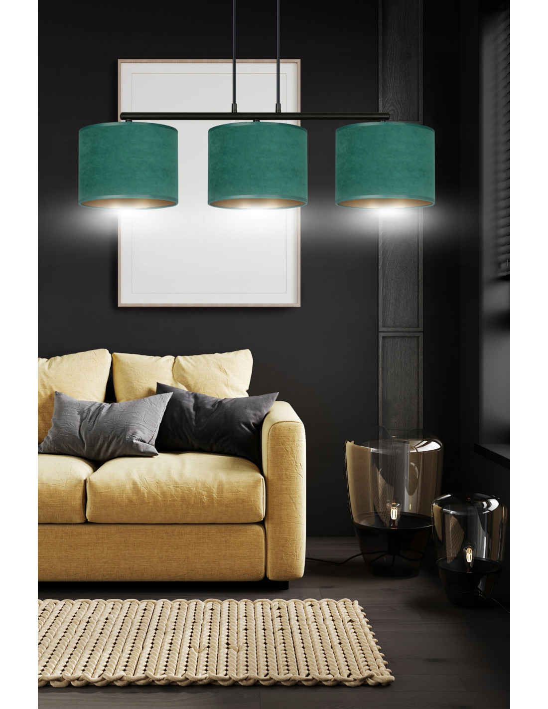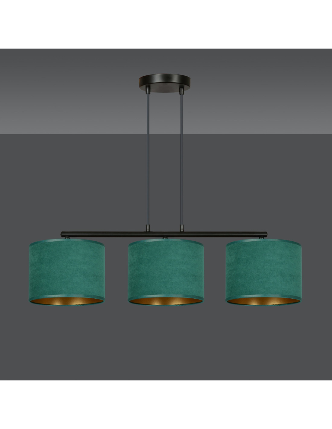 Abażury lampy zostały wykonane z trwałego materiału o welurowej fakturze z złotym środkiem, co podkreśla elegancję i nowoczesny charakter produktu. Lampa dostępna jest w kilku kolorach, w tym czarnym, białym, szarym, zielonym oraz różowym, co pozwala na wybór opcji idealnie dopasowanej do wnętrza.