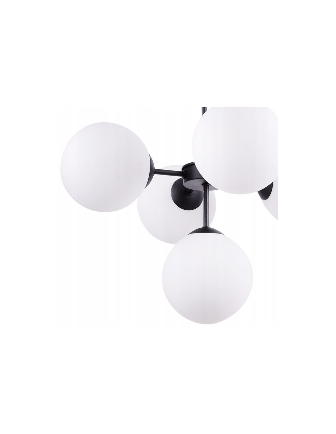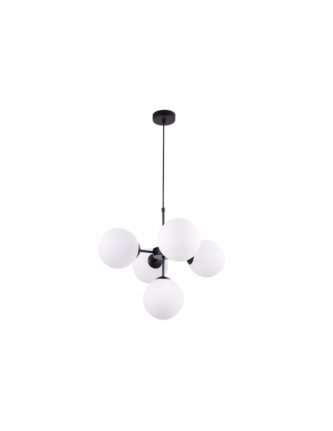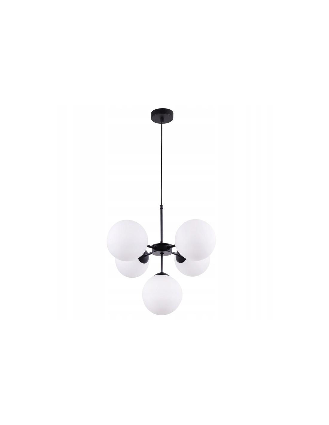 Produkt charakteryzuje się długą, metalową konstrukcją w eleganckim czarnym kolorze, która stanowi solidną bazę dla pięciu kloszy wykonanych ze szkła. Każdy z tych kloszy nie tylko pełni funkcję estetyczną, ale również zapewnia miękkie, rozproszone światło, co tworzy przytulną atmosferę w salonie, sypialni czy jadalni. Mleczne klosze są idealnym rozwiązaniem dla osób, które stawiają na komfortowe oświetlenie.