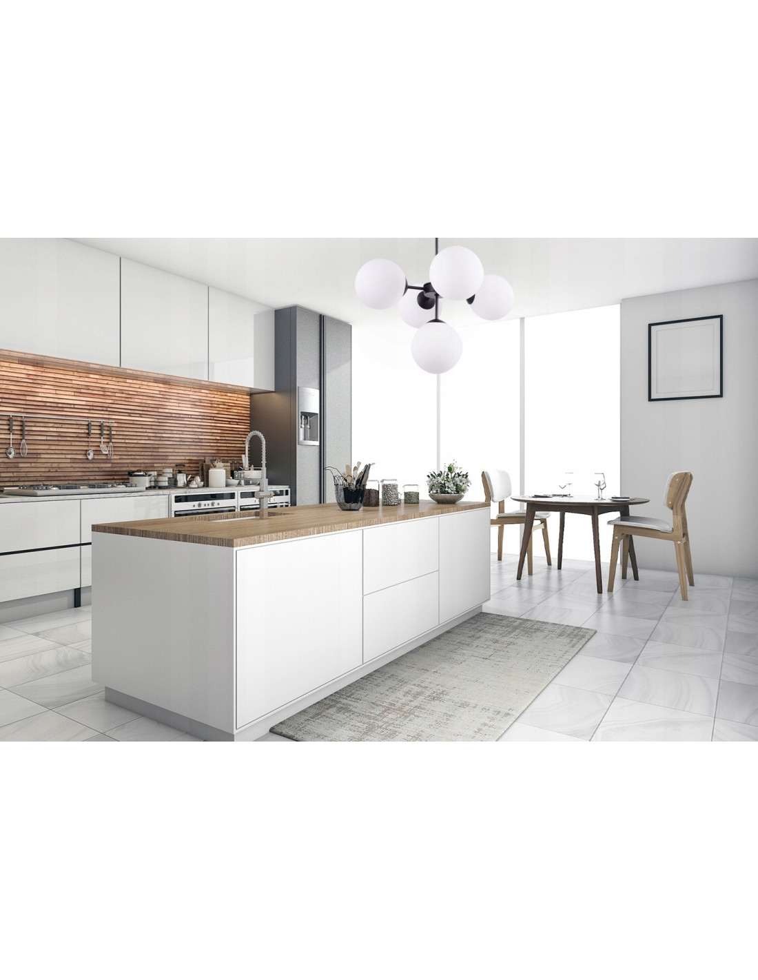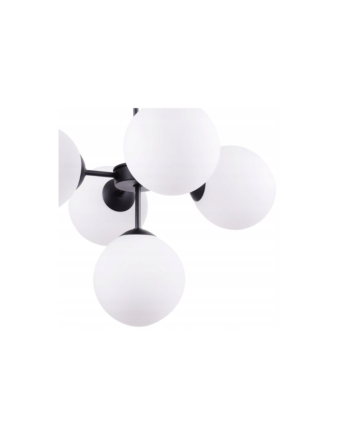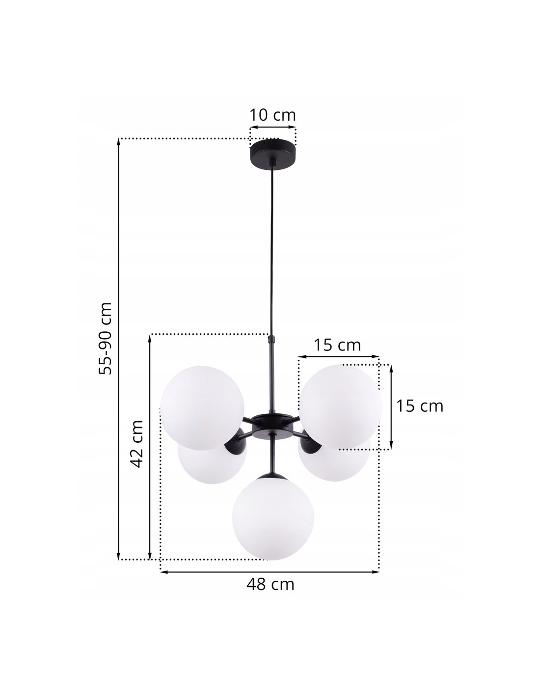 Produkt charakteryzuje się długą, metalową konstrukcją w eleganckim czarnym kolorze, która stanowi solidną bazę dla pięciu kloszy wykonanych ze szkła. Każdy z tych kloszy nie tylko pełni funkcję estetyczną, ale również zapewnia miękkie, rozproszone światło, co tworzy przytulną atmosferę w salonie, sypialni czy jadalni. Mleczne klosze są idealnym rozwiązaniem dla osób, które stawiają na komfortowe oświetlenie.
