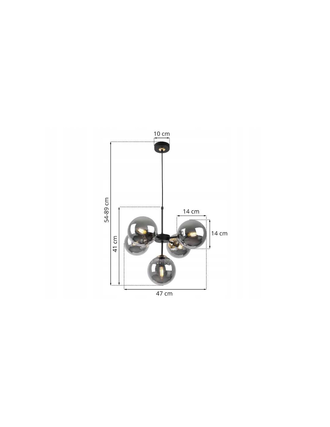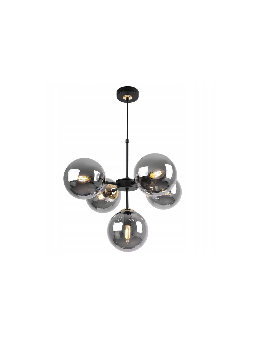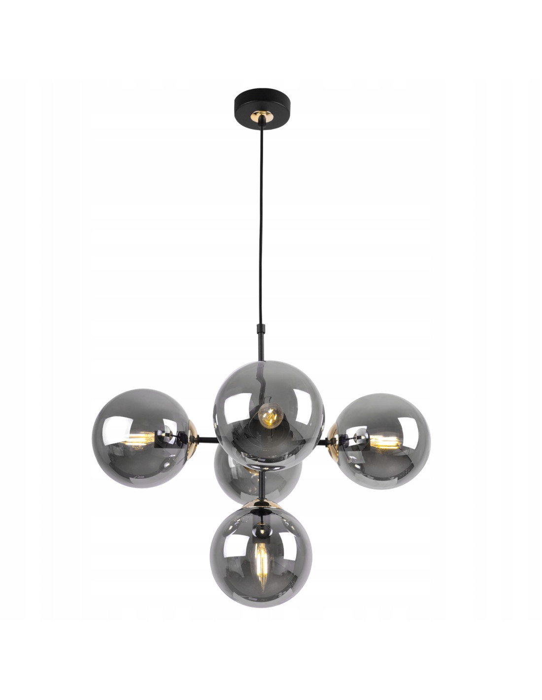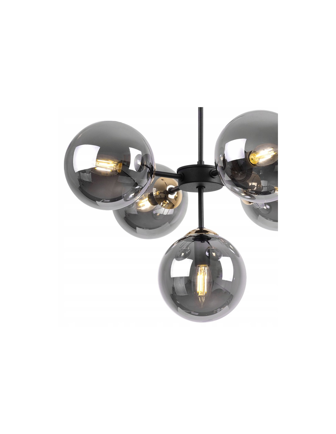 Jednym z istotnych atutów tego modelu jest metalowa konstrukcja w klasycznym czarnym kolorze, która stanowi mocny akcent wizualny. Kluczowym elementem są pięć kloszy wykonanych z wysokiej jakości szkła, które zostały wzbogacone o złote wykończenie. Taki połączenie kolorów wprowadza do pomieszczenia wyrafinowaną atmosferę, która nigdy nie wychodzi z mody.