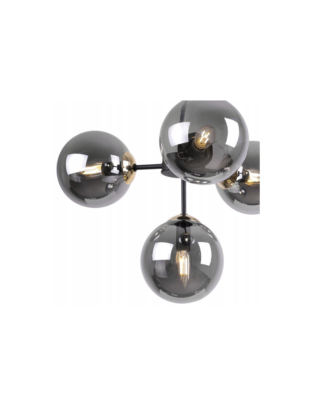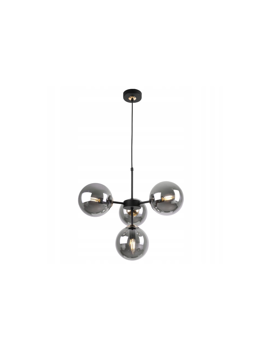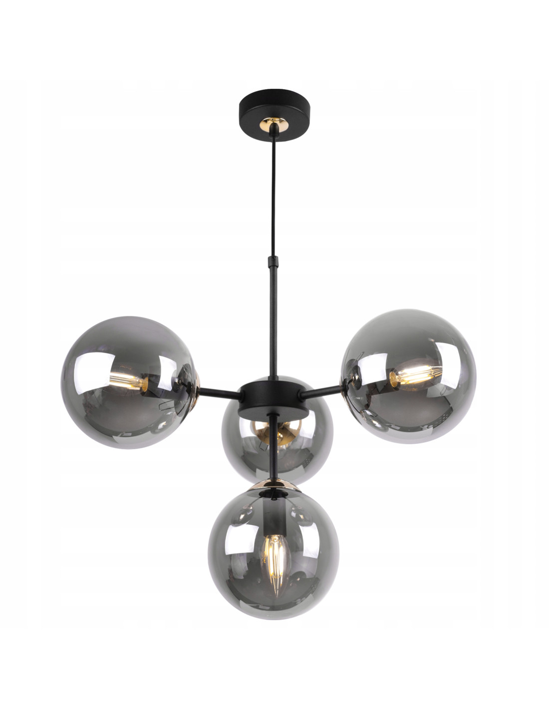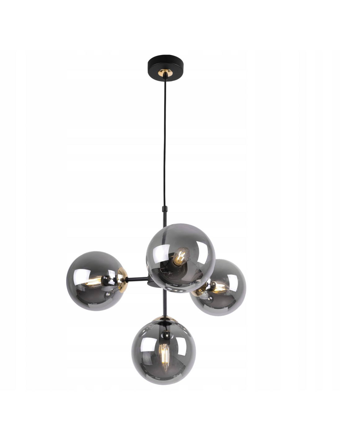 Lampa wyróżnia się czterema szklanymi kloszami, które emitują miękkie, rozproszone światło. Zastosowanie przydymionego szkła sprawia, że źródło światła jest przyjemne dla oka, co pozwala na stworzenie przytulnej atmosfery w salonie, jadalni czy sypialni. Takie rozwiązanie sprawdzi się także w przestrzeniach biurowych, a także w nowoczesnych kawiarniach czy recepcjach hotelowych.