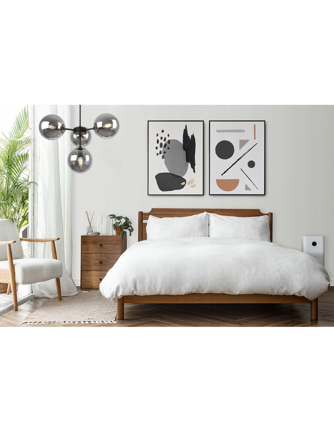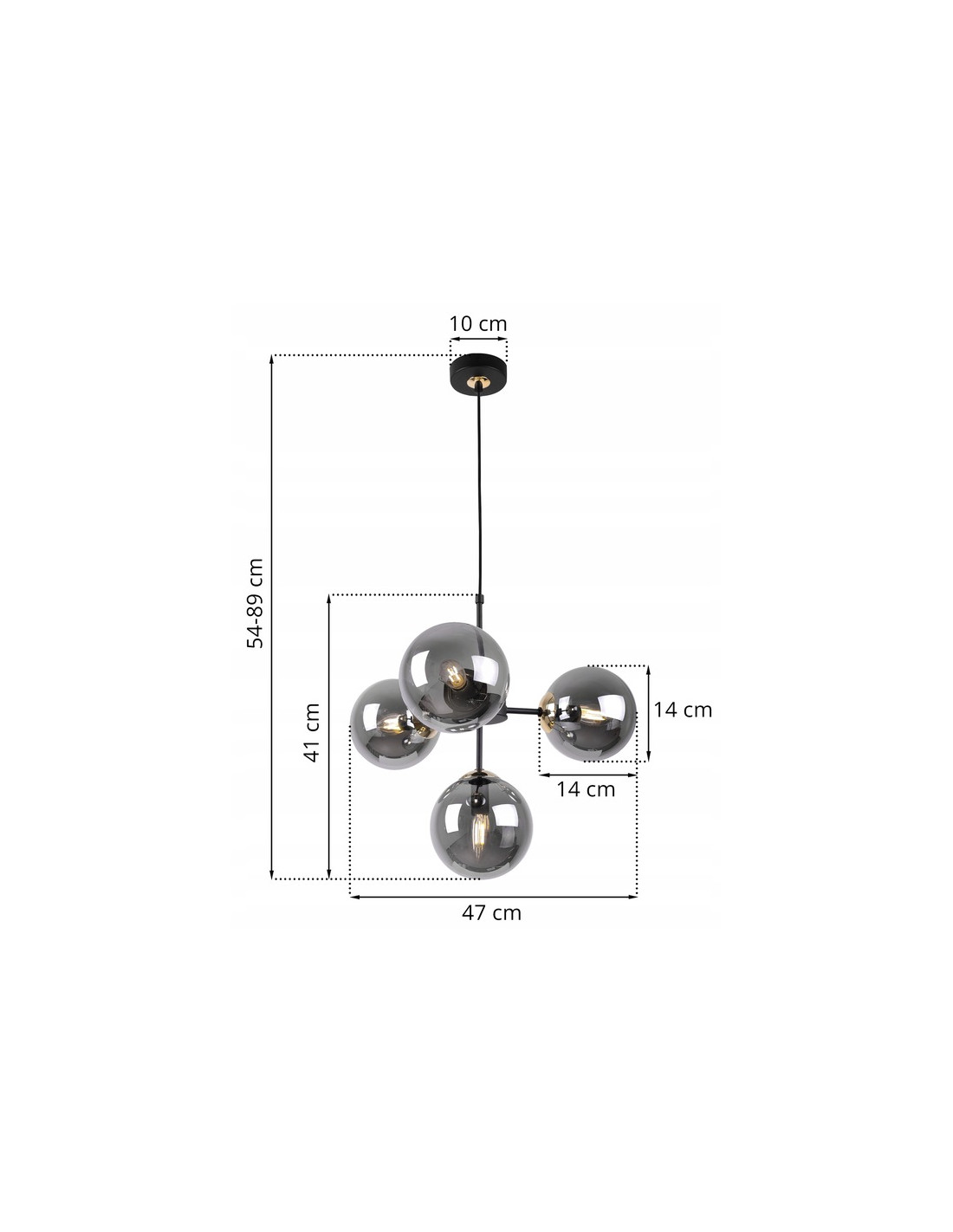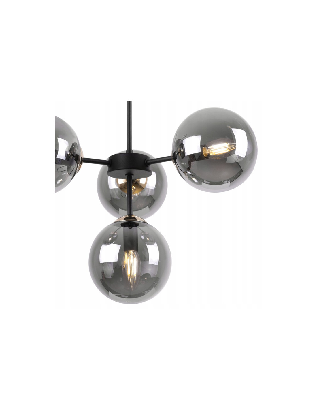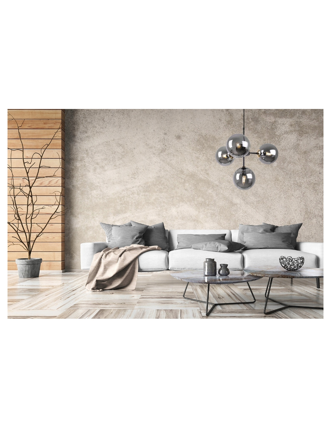 Lampa wyróżnia się czterema szklanymi kloszami, które emitują miękkie, rozproszone światło. Zastosowanie przydymionego szkła sprawia, że źródło światła jest przyjemne dla oka, co pozwala na stworzenie przytulnej atmosfery w salonie, jadalni czy sypialni. Takie rozwiązanie sprawdzi się także w przestrzeniach biurowych, a także w nowoczesnych kawiarniach czy recepcjach hotelowych.