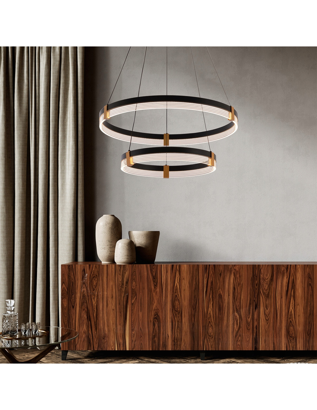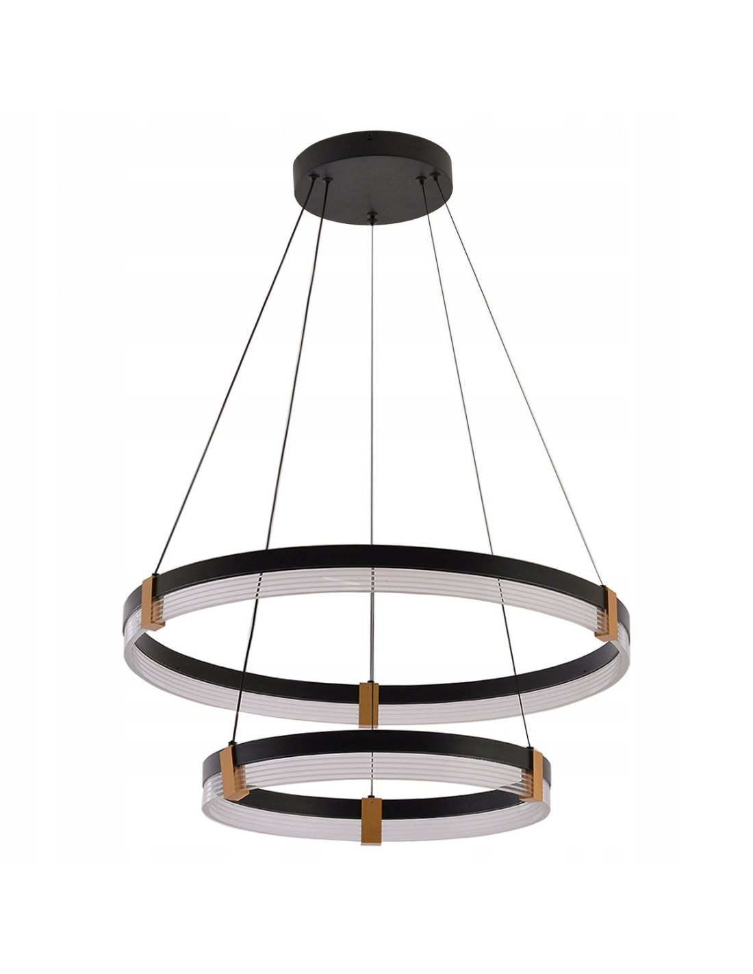 Lampa wisząca Plum 2 to doskonałe połączenie nowoczesnego designu z funkcjonalnością, które idealnie wpasuje się w każde wnętrze. Składająca się z dwóch metalowych obręczy w czarnym kolorze, ozdobionych złotymi elementami, lampa ta nie tylko oświetli pomieszczenie, ale również stanie się jego stylową ozdobą. Transparentny akryl, z którego wykonane są dyfuzory, efektywnie rozprasza światło, nadając mu miękkości i elegancji.