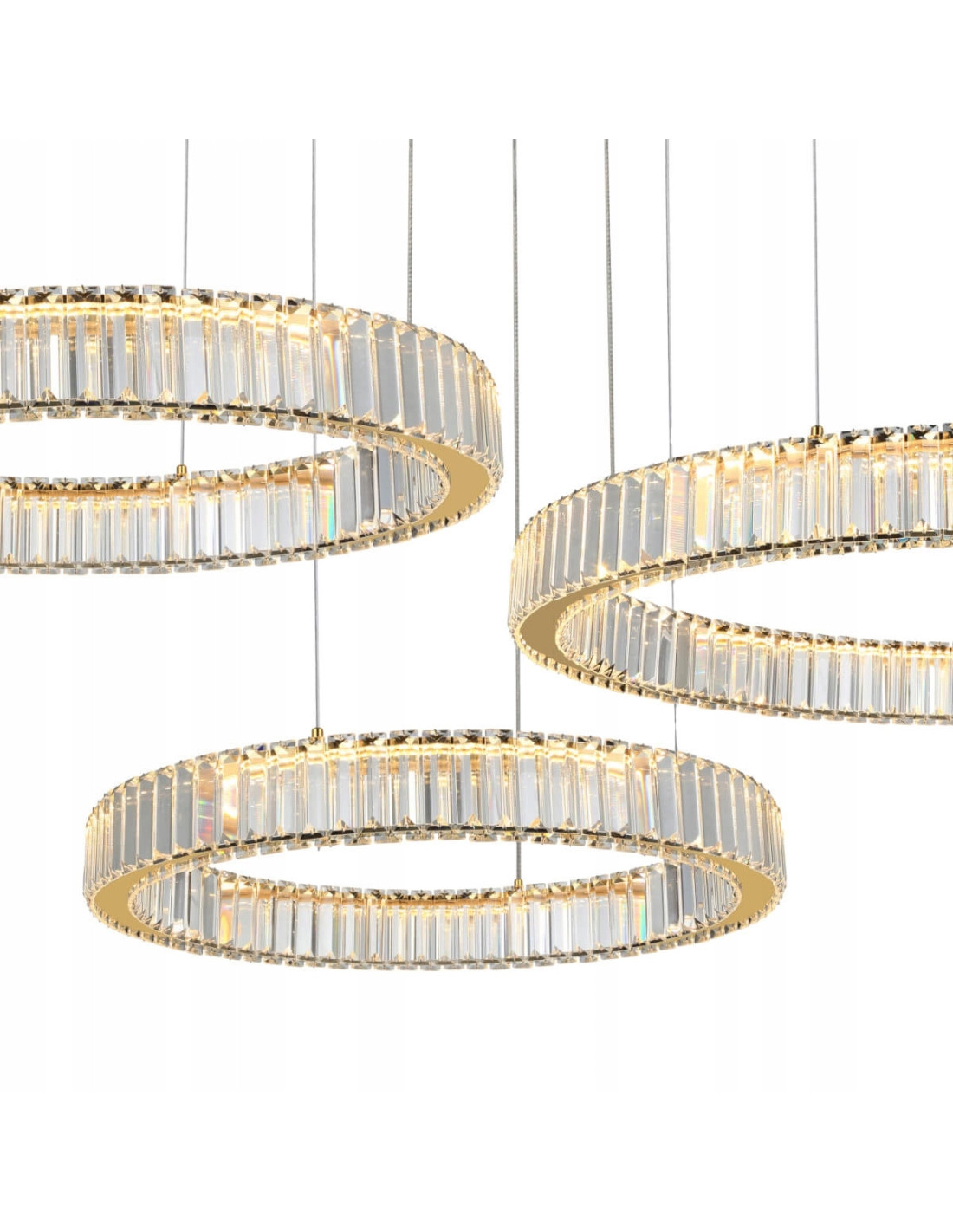Ogromna lampa 3 Ringi kryształowe LED SPARK PENDANT to idealne rozwiązanie dla osób poszukujących elegancji i luksusu w swoim wnętrzu. Z jej pomocą stworzysz niepowtarzalny klimat, który z pewnością przyciągnie wzrok każdego gościa. Wykończenie w złotym kolorze oraz elementy kryształowe, które rozpraszają światło, tworzą wyjątkowy efekt wizualny, nadając pomieszczeniom nowoczesny charakter.
