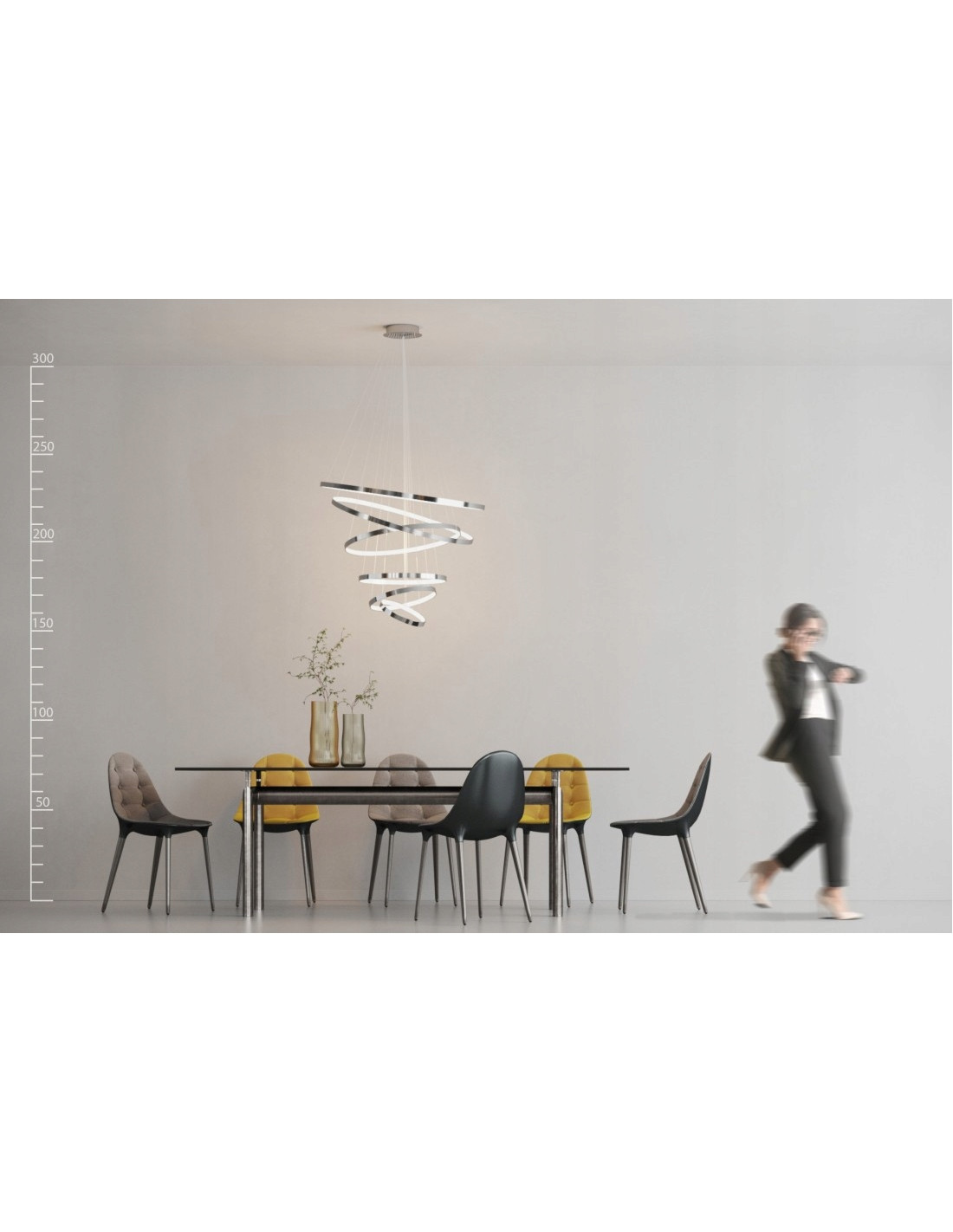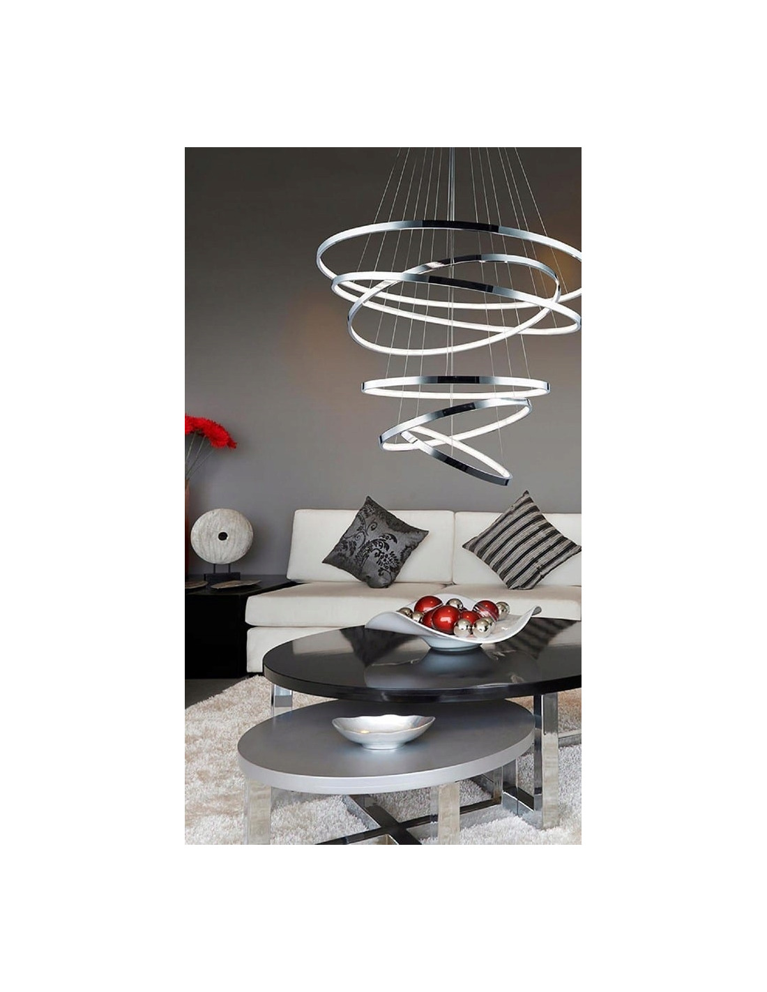 Lampa wisząca WHEEL LED to wyjątkowy element dekoracyjny, który z pewnością przyciągnie wzrok w każdym nowoczesnym wnętrzu. Jej innowacyjny design, składający się z sześciu pierścieni o różnych średnicach, sprawia, że lampa staje się focal pointem każdego pomieszczenia. Dzięki możliwości regulacji wysokości, od 200 do 320 cm, jest idealna do różnorodnych przestrzeni - od sypialni, przez salon, po jadalnię.