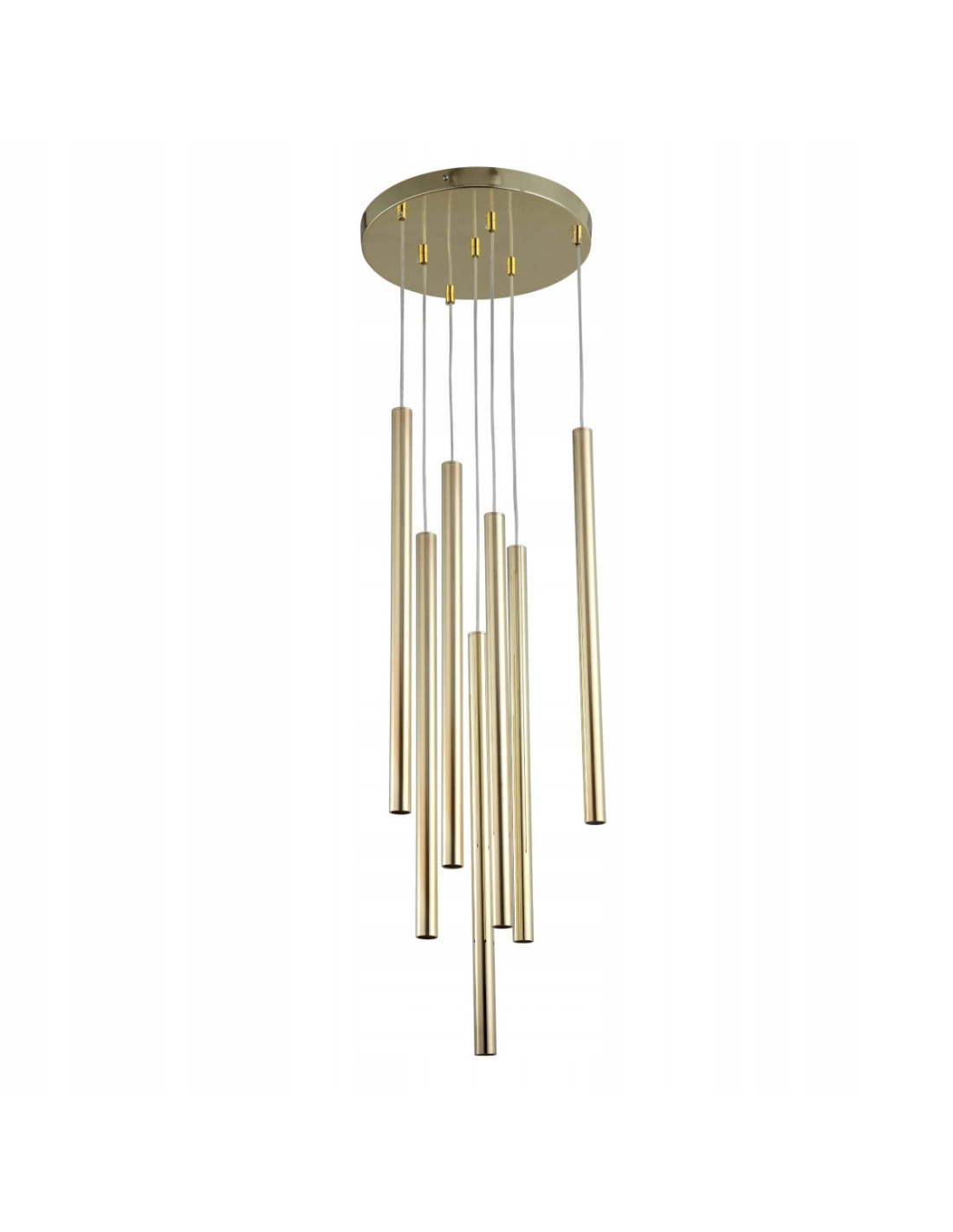 Zaprezentuj swój styl i wprowadź do swojego wnętrza niepowtarzalny klimat dzięki luksusowej siedmiopłomiennej lampie wiszącej Lungo. Ta wyjątkowa lampa nie tylko oświetli Twoje pomieszczenia, ale stanie się również centralnym punktem dekoracyjnym każdej przestrzeni. Jej złota kolorystyka oraz minimalistyczny design sprawiają, że doskonale wkomponuje się w różnorodne aranżacje, takie jak klasyczne, nowoczesne czy industrialne.