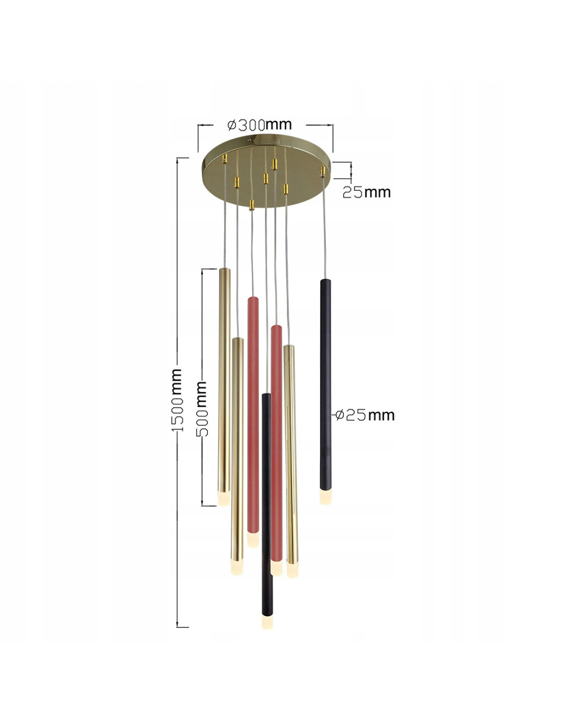 W centralnym punkcie lampy znajduje się złota, okrągła podsufitka, która wykonana jest z metalu, co zwiększa jej trwałość oraz estetykę. Z podsufitki wychodzi siedem metalowych ramion, które kończą się gniazdami na żarówki o standardowym gwincie G9. Ramiona przyjmują formę eleganckich tub w różnorodnych kolorach: złotym, czarnym i czerwonym, co tworzy niepowtarzalny efekt wizualny.