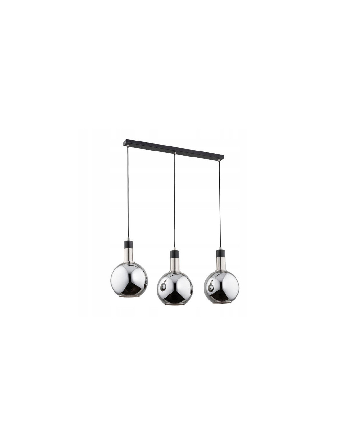 Stelaż lampy wykonany jest ze stali lakierowanej w kolorze srebrnym i czarnym, co dodaje mu oraz chromowanym kloszom wyjątkowego charakteru. Dzięki wiszącym kloszom rozmieszczonym w jednej linii, lampa staje się nie tylko oświetleniem, ale również stylowym elementem dekoracyjnym, który przyciąga wzrok.