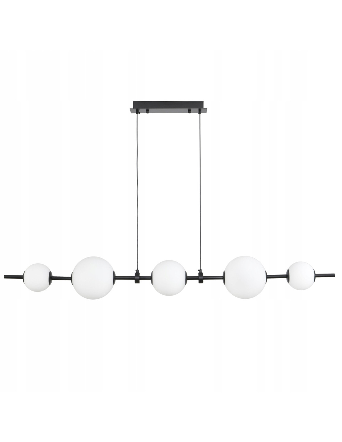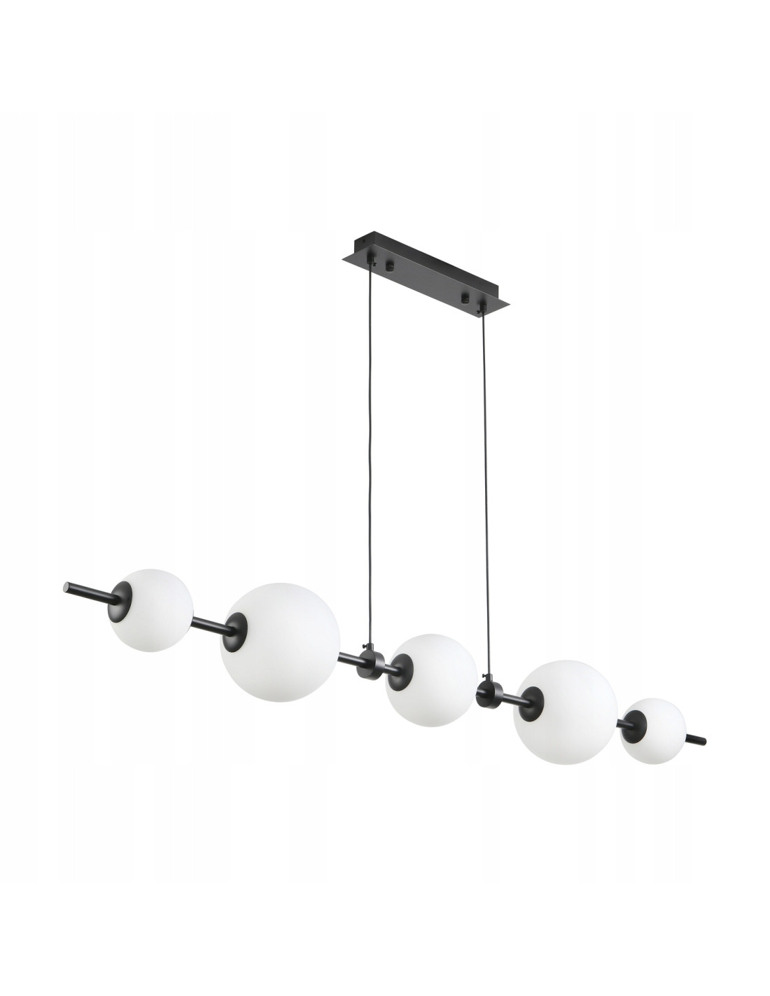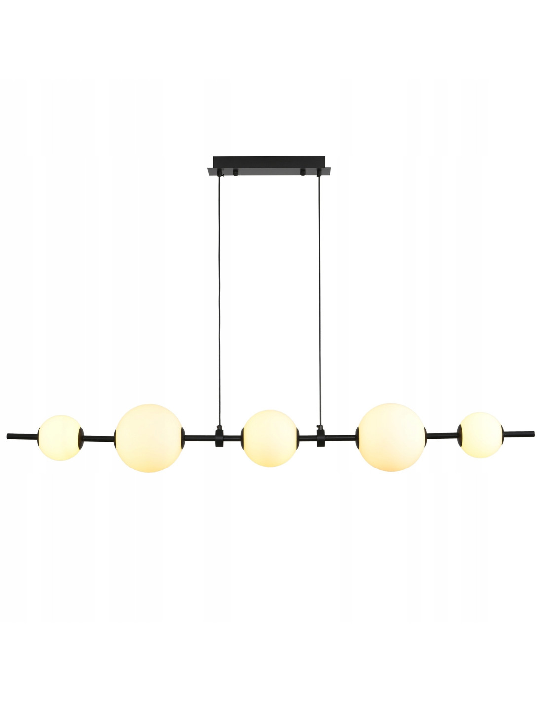 Lampa wisząca MILA to połączenie elegancji i nowoczesności, które idealnie wkomponuje się w różnorodne wnętrza. Składająca się z długiej, poziomej metalowej listwy w kolorze czarnym oraz pięciu białych kulistych kloszy, ta lampa nie tylko oświetli przestrzeń, ale także nada jej wyjątkowy charakter. Dzięki stonowanej kolorystyce, listwa w kolorze czarnym wraz z kloszami z satynowego mlecznego szkła tworzy harmonijną całość, która nadaje pomieszczeniu subtelności i elegancji.