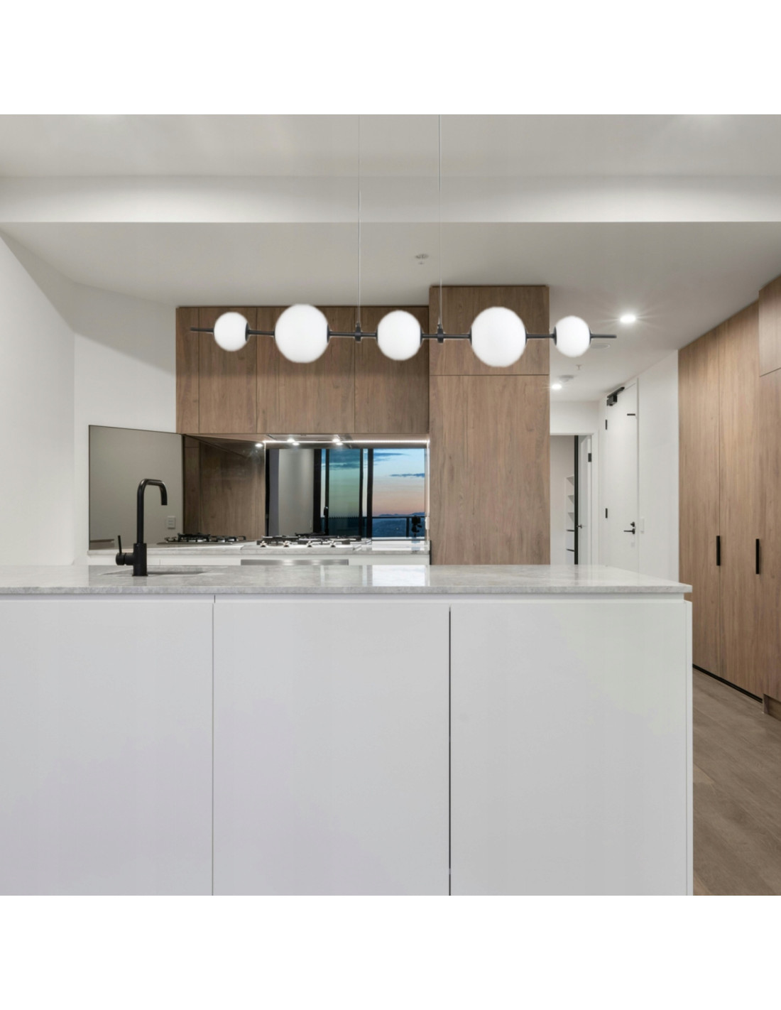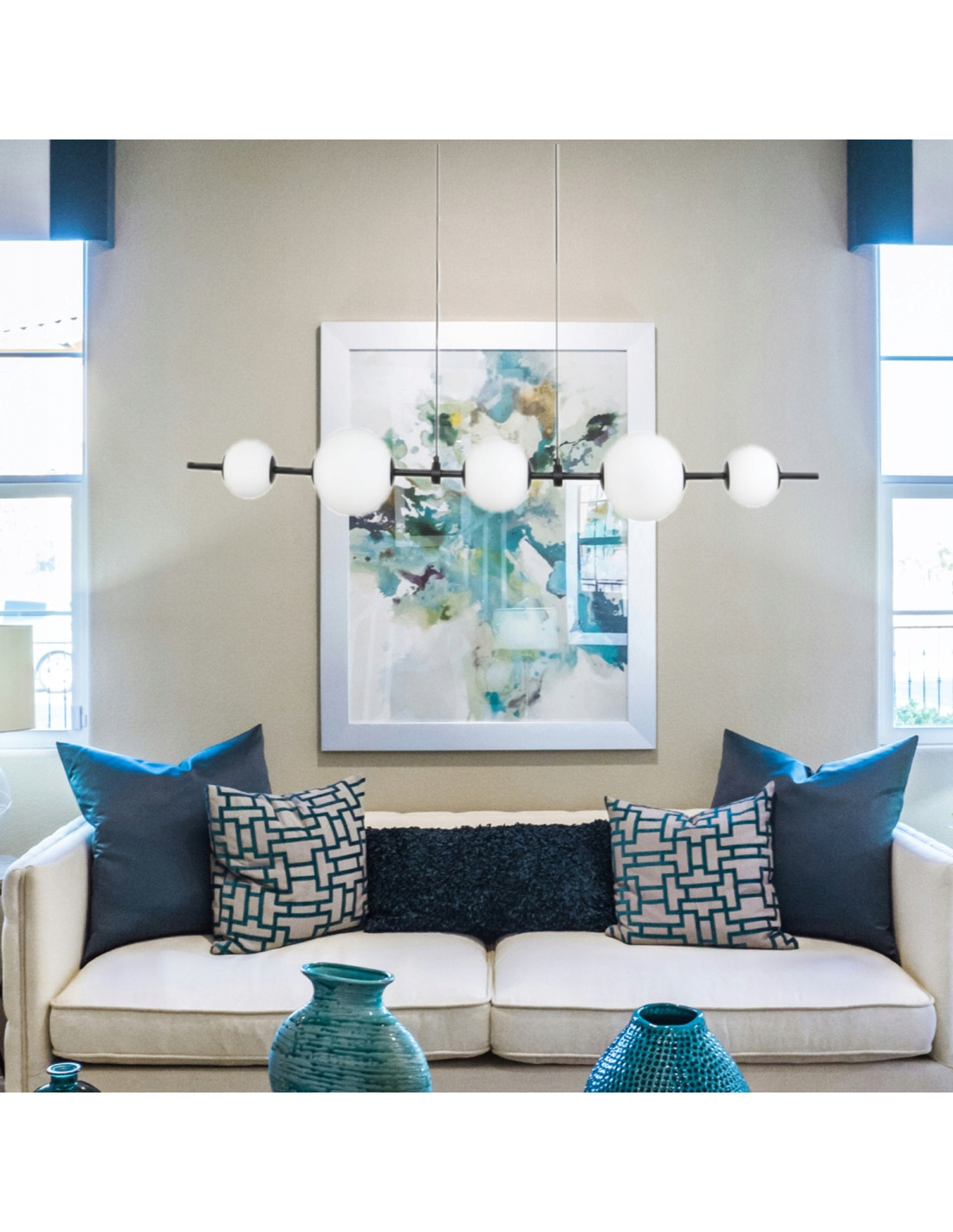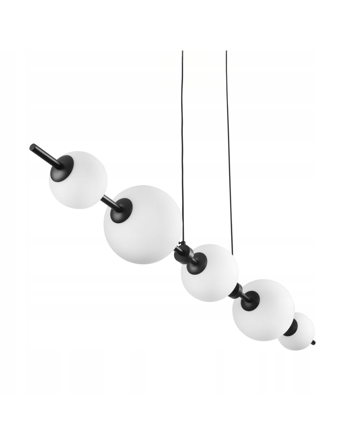 Lampa wisząca MILA to połączenie elegancji i nowoczesności, które idealnie wkomponuje się w różnorodne wnętrza. Składająca się z długiej, poziomej metalowej listwy w kolorze czarnym oraz pięciu białych kulistych kloszy, ta lampa nie tylko oświetli przestrzeń, ale także nada jej wyjątkowy charakter. Dzięki stonowanej kolorystyce, listwa w kolorze czarnym wraz z kloszami z satynowego mlecznego szkła tworzy harmonijną całość, która nadaje pomieszczeniu subtelności i elegancji.