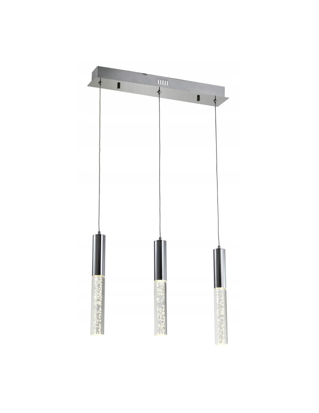 Mocowanie sufitowe w kolorze chromu łączy w sobie prostotę i minimalizm, co czyni go idealnym do każdej aranżacji. Lampa zawieszona jest na cienkim przewodzie, co podkreśla jej lekkość i nowoczesny charakter. Korpus lampy wykonany jest z wysokiej jakości materiałów, z chromowaną górą oraz przezroczystą dolną częścią wypełnioną małymi bąbelkami, które są subtelnie podświetlane, tworząc efekt unoszących się w wodzie bąbelków.