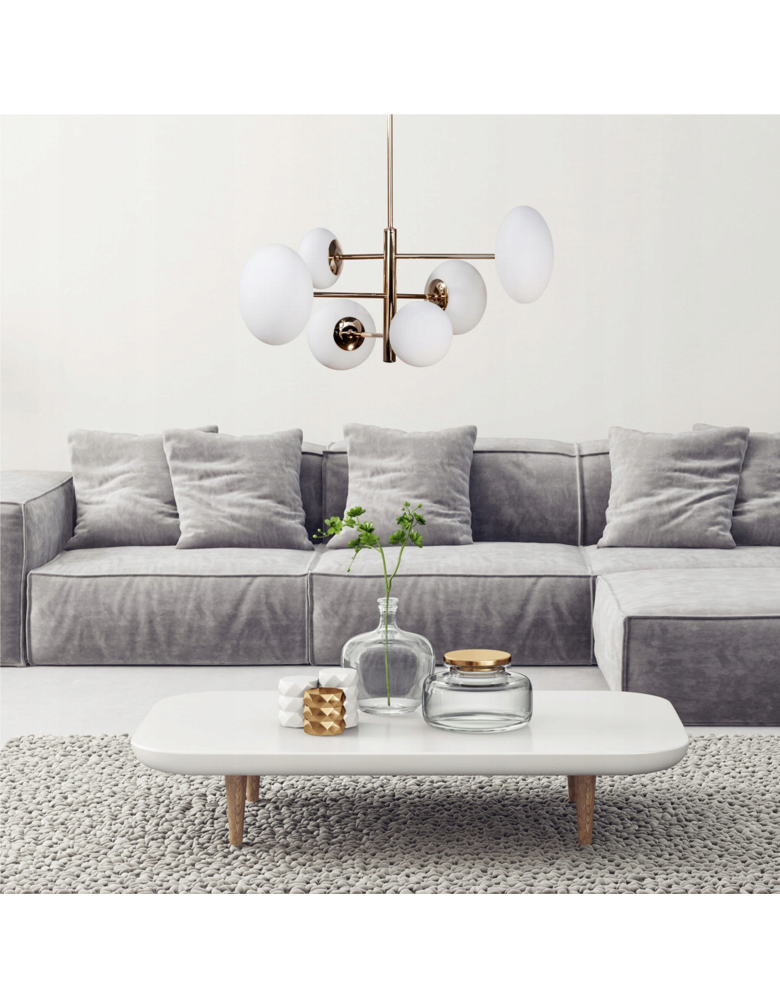 Odkryj lampę wiszącą OMI, które łączy w sobie minimalistyczny design oraz efektowny wygląd. Ten model z sześcioma kulistymi kloszami i prostą podsufitką to doskonały wybór dla tych, którzy cenią sobie nowoczesne rozwiązania w aranżacji wnętrz. Złote ramiona i eleganckie białe klosze sprawiają, że lampa wkomponuje się w wiele stylów, dodając pomieszczeniom wyjątkowego charakteru.
