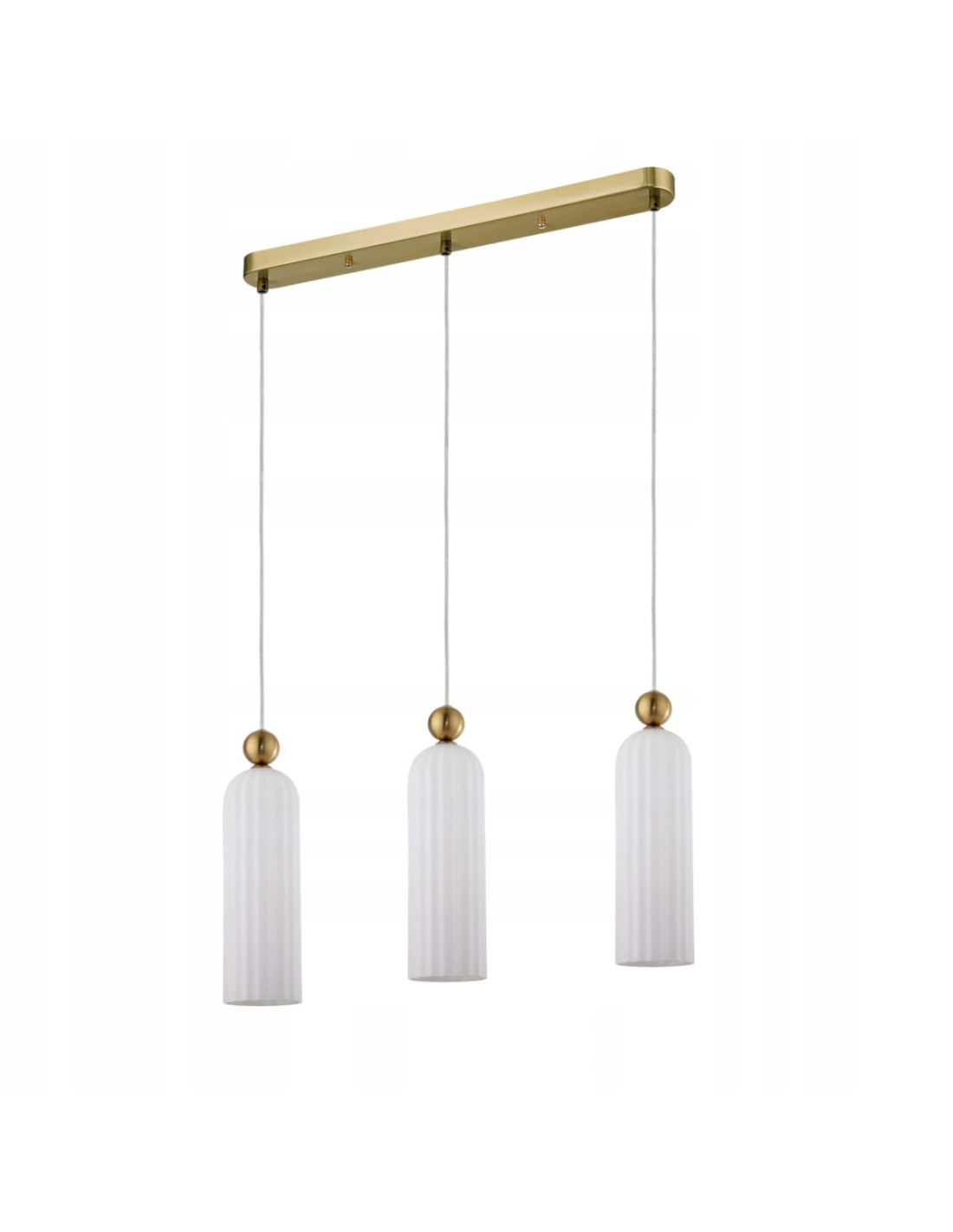 Stylowy dekoracyjny element w postaci złotych kuleczek podkreśla elegancję lampy, która jest osadzona na wąskiej, prostokątnej podstawie również w kolorze złotym. Połączenie bieli i złota tworzy niepowtarzalny duet, który doskonale komponuje się z różnorodnymi aranżacjami, zarówno w neutralnych, jak i intensywnych kolorach. Idealnie odnajdzie się na białym, zielonym czy brązowym tle, dodając mu klasy i szyku.