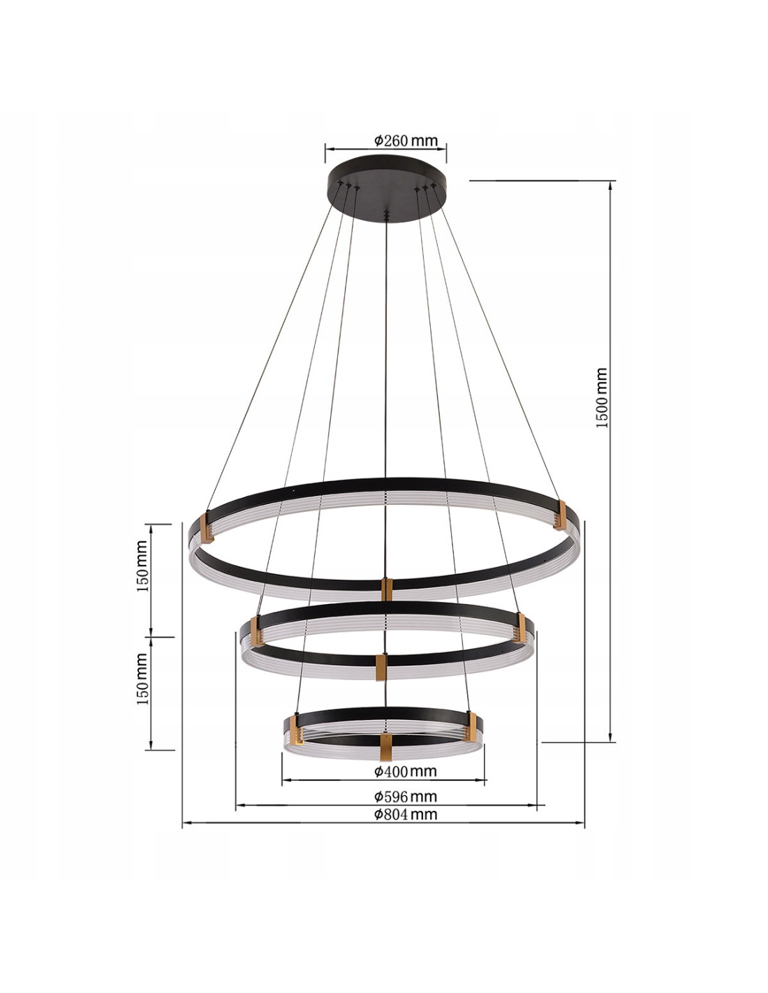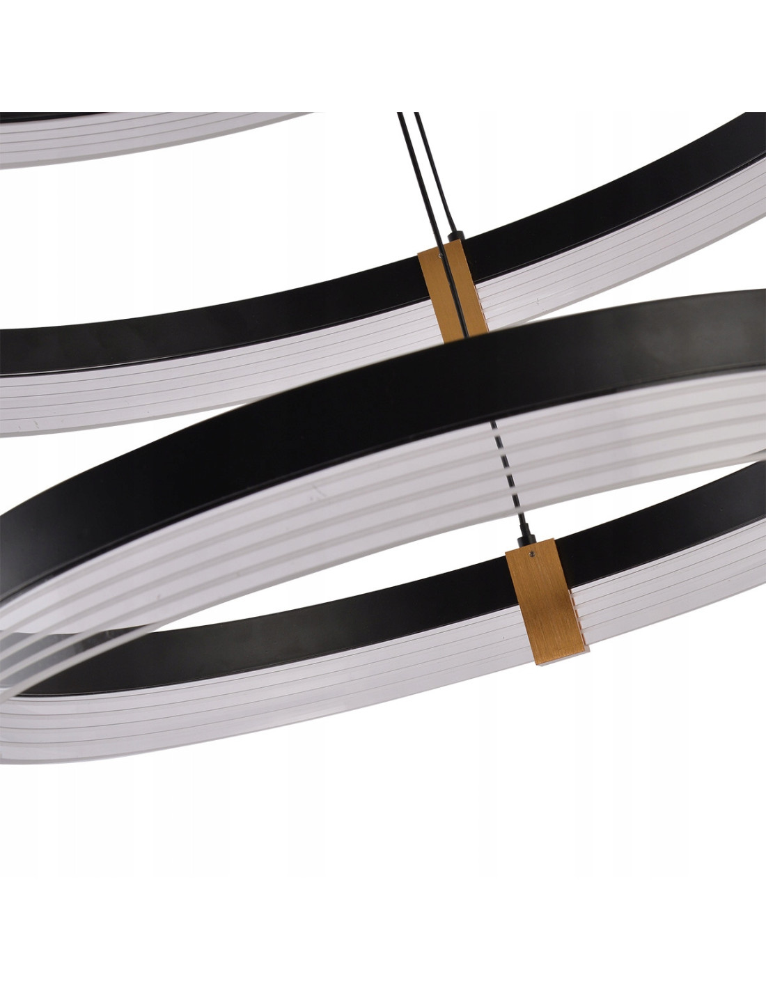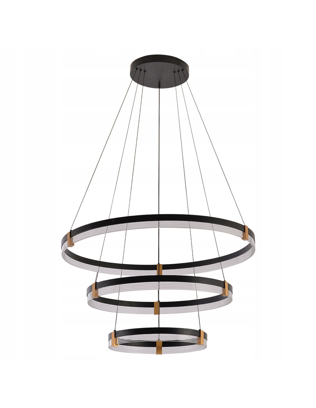 Wykonana z wysokiej jakości materiałów, lampa charakteryzuje się połączeniem czarnego metalu i transparentnego akrylu. Złote akcenty dodają jej luksusowego charakteru, sprawiając, że stanie się centralnym punktem każdego pomieszczenia. Obręcze z akrylu pełnią rolę dyfuzorów, które subtelnie rozpraszają światło, tworząc przyjemną atmosferę.