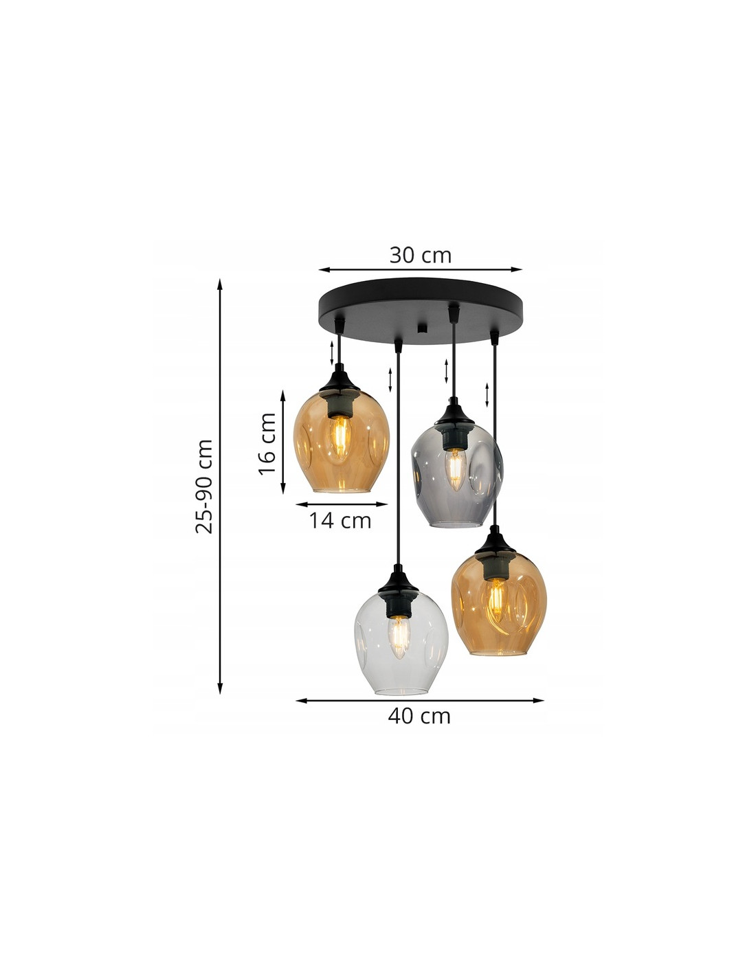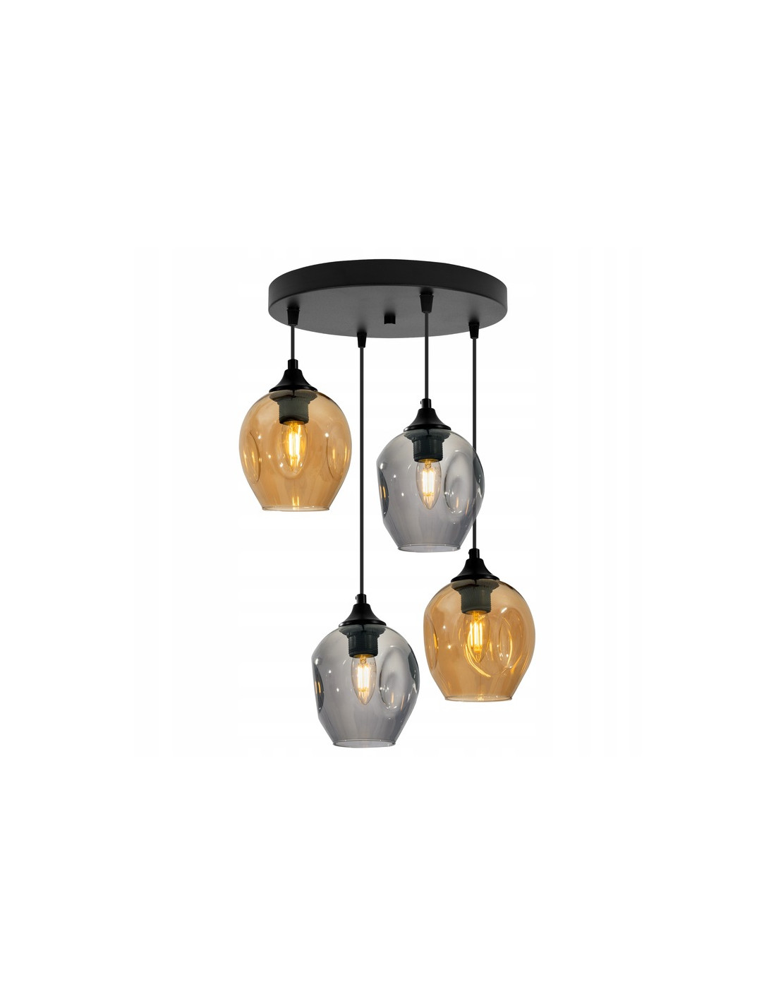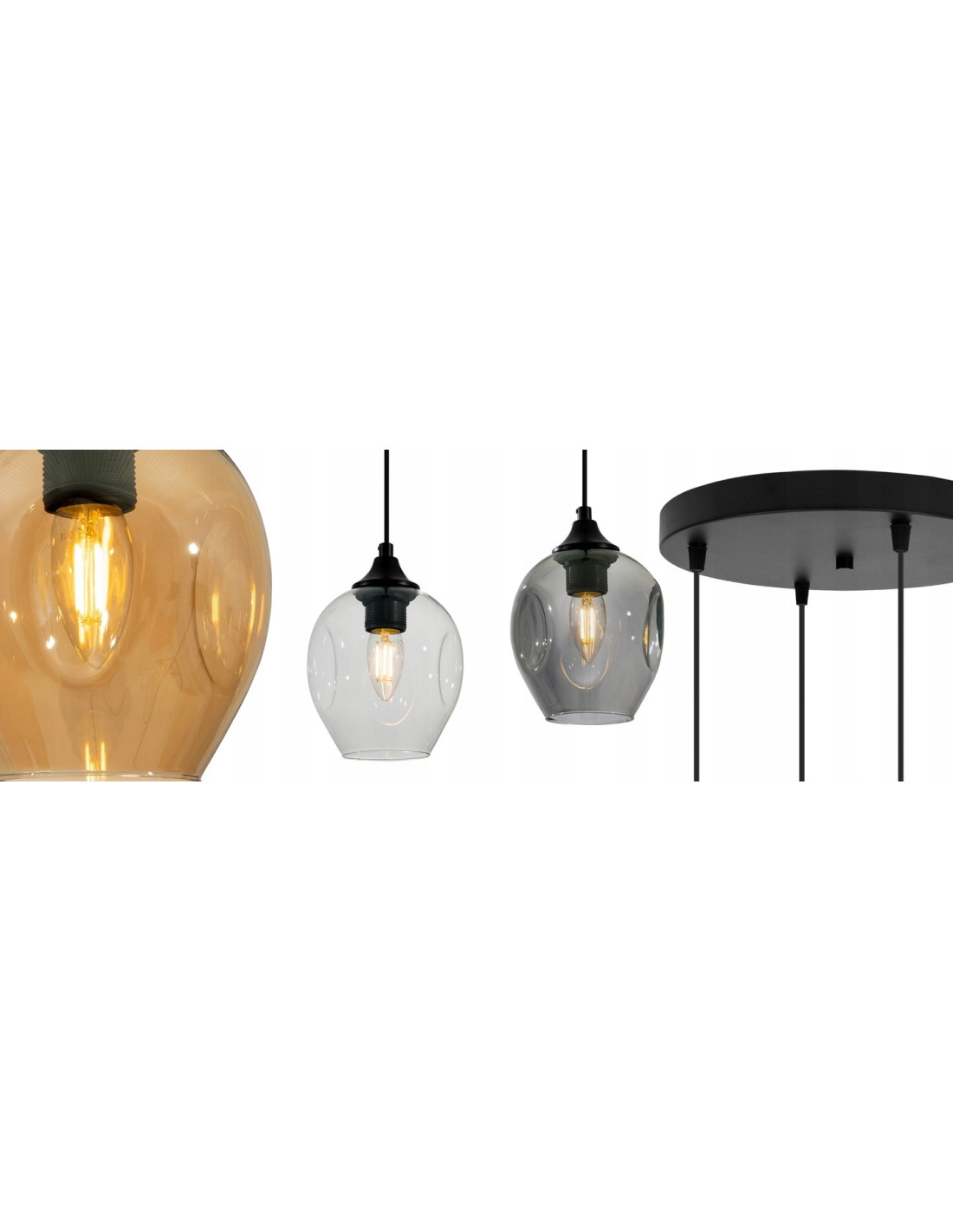Okrągłe klosze, dostępne w wersji dymionych oraz bursztynowych, delikatnie rozpraszają światło, tworząc przyjemną atmosferę oraz subtelny blask w każdym pomieszczeniu. Dzięki harmonijnemu rozmieszczeniu kloszy, lampa wprowadza równowagę oraz elegancję do wnętrz, stając się nie tylko elementem oświetleniowym, ale także dekoracyjnym.