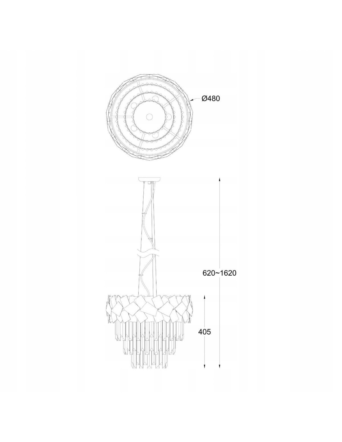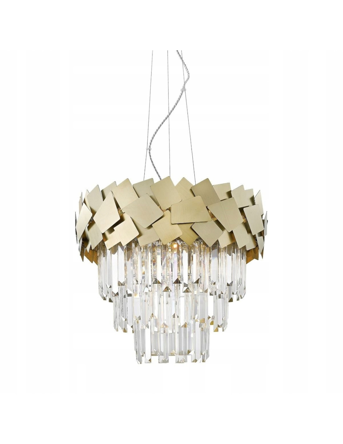 Jej unikalna konstrukcja składa się z trzech poziomów kaskadowo zawieszonych kryształków, które w połączeniu z metalowymi płytkami o geometrycznych kształtach i złotym wykończeniem tworzą efektowne połączenie stylów. Lampa posiada średnicę wynoszącą 48 cm i regulowaną wysokość w zakresie od 62 do 162 cm, co pozwala na dostosowanie jej do różnorodnych przestrzeni.