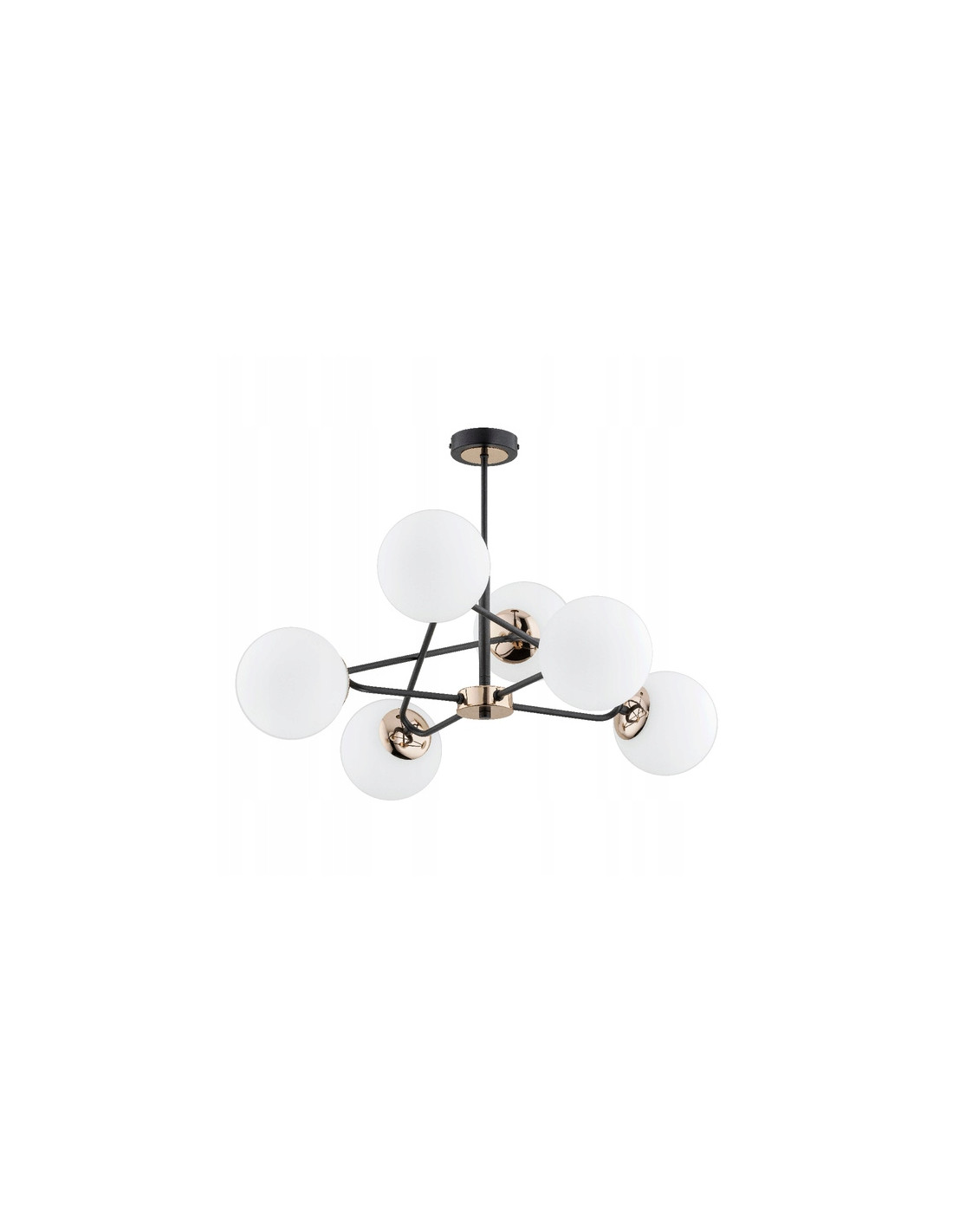 Lampa została zaprojektowana z dużą dbałością o szczegóły, co widać w każdym detalu jej wykonania. Szklane klosze w odcieniu białym wspaniale kontrastują z czarnymi metalowymi elementami oraz z delikatnymi złotymi wstawkami, które nadają jej wyjątkowego charakteru. Dzięki połączeniu tych kolorów, lampa wydobywa z wnętrza głębię i elegancję, a sama w sobie staje się przyciągającym wzrok akcentem.
