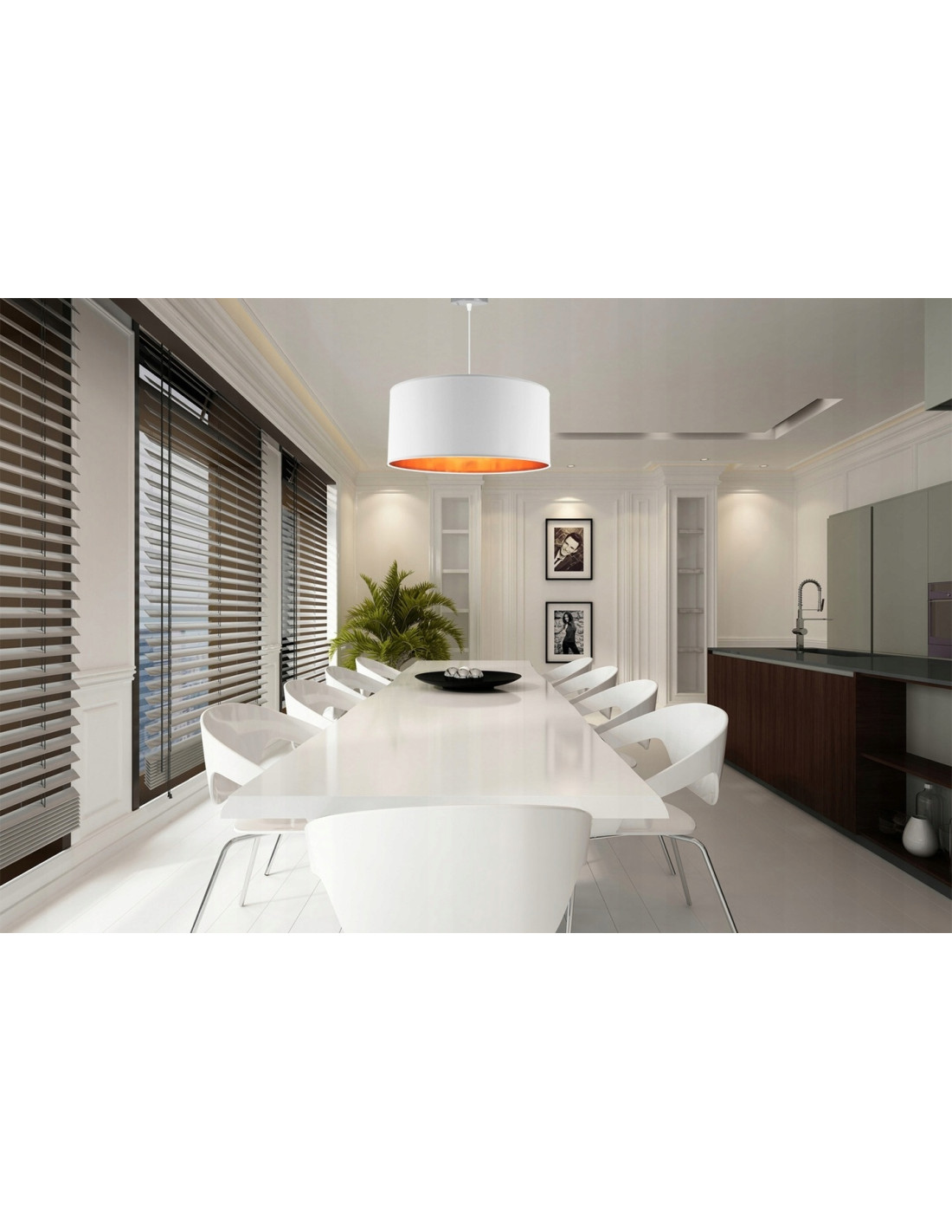 Szeroka lampa abażurowa z pojedynczym źródłem światła do gabinetu SHADE 60W to idealny wybór dla osób, które cenią sobie elegancję i funkcjonalność. Ta lampa wisząca, zaprojektowana w minimalistycznym stylu, wprowadza do wnętrza nowoczesny akcent dzięki designerskiemu rozwiązaniu w postaci abażura ze złotym wnętrzem. Jej uniwersalny charakter sprawia, że doskonale odnajduje się w różnorodnych przestrzeniach, od biura po jadalnię.