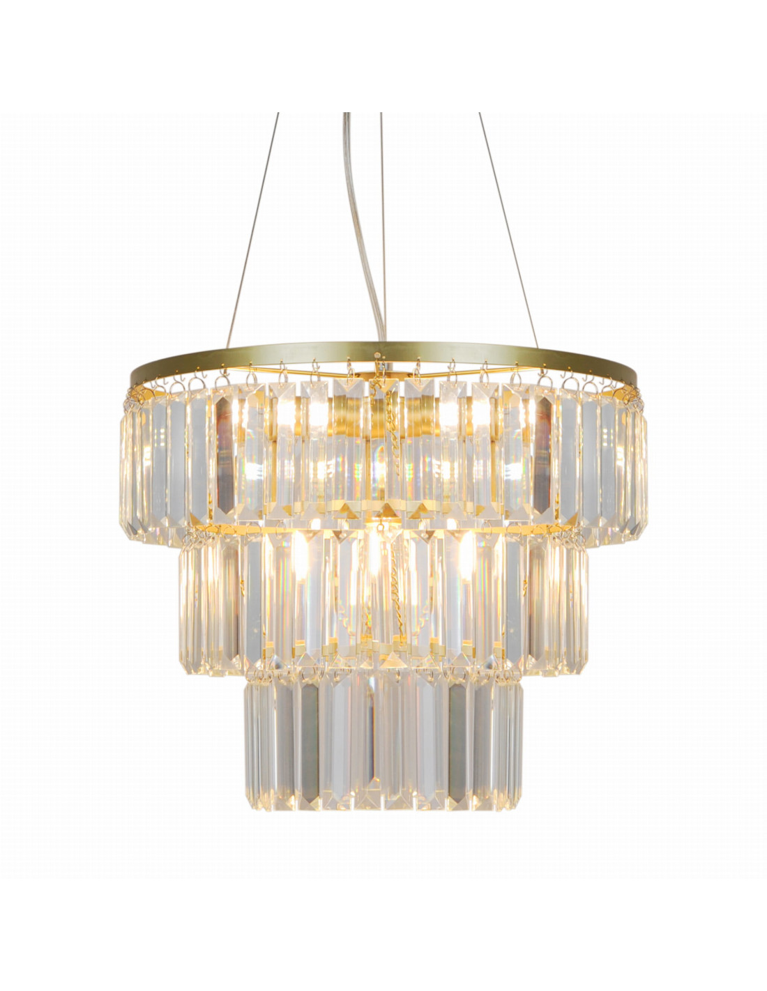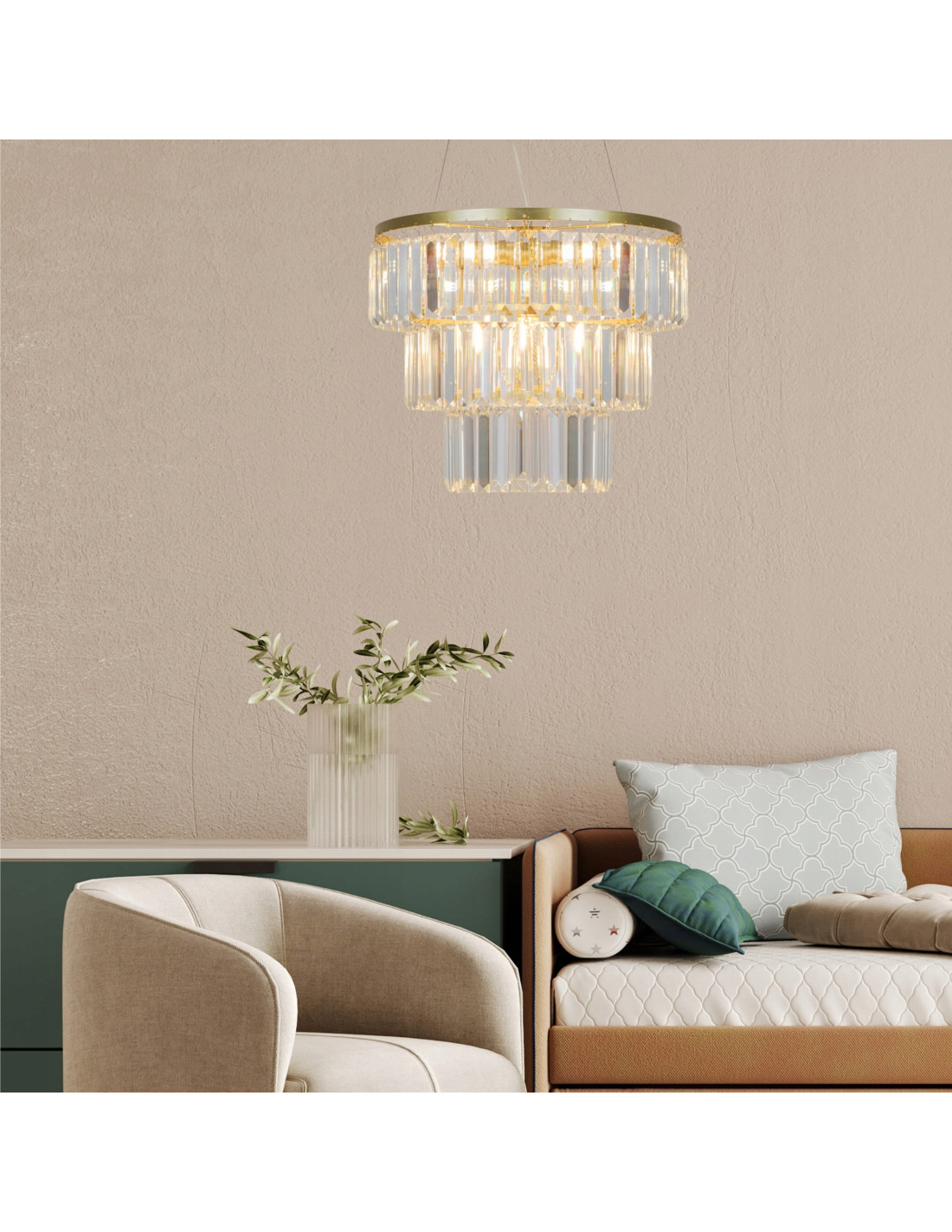 Kryształowy żyrandol z warstwami kryształów TIFANNY E14 to wyjątkowa lampa wisząca, która doskonale podkreśli styl glam oraz elegancję każdego wnętrza. Zaprojektowana z myślą o najbardziej wymagających klientach, stanie się ozdobą salonu, jadalni, sypialni czy biura. Połączenie złotego metalowego stelaża z przezroczystymi kryształami tworzy harmonijną całość, która przyciąga wzrok i sprawia, że wnętrze nabiera blasku.