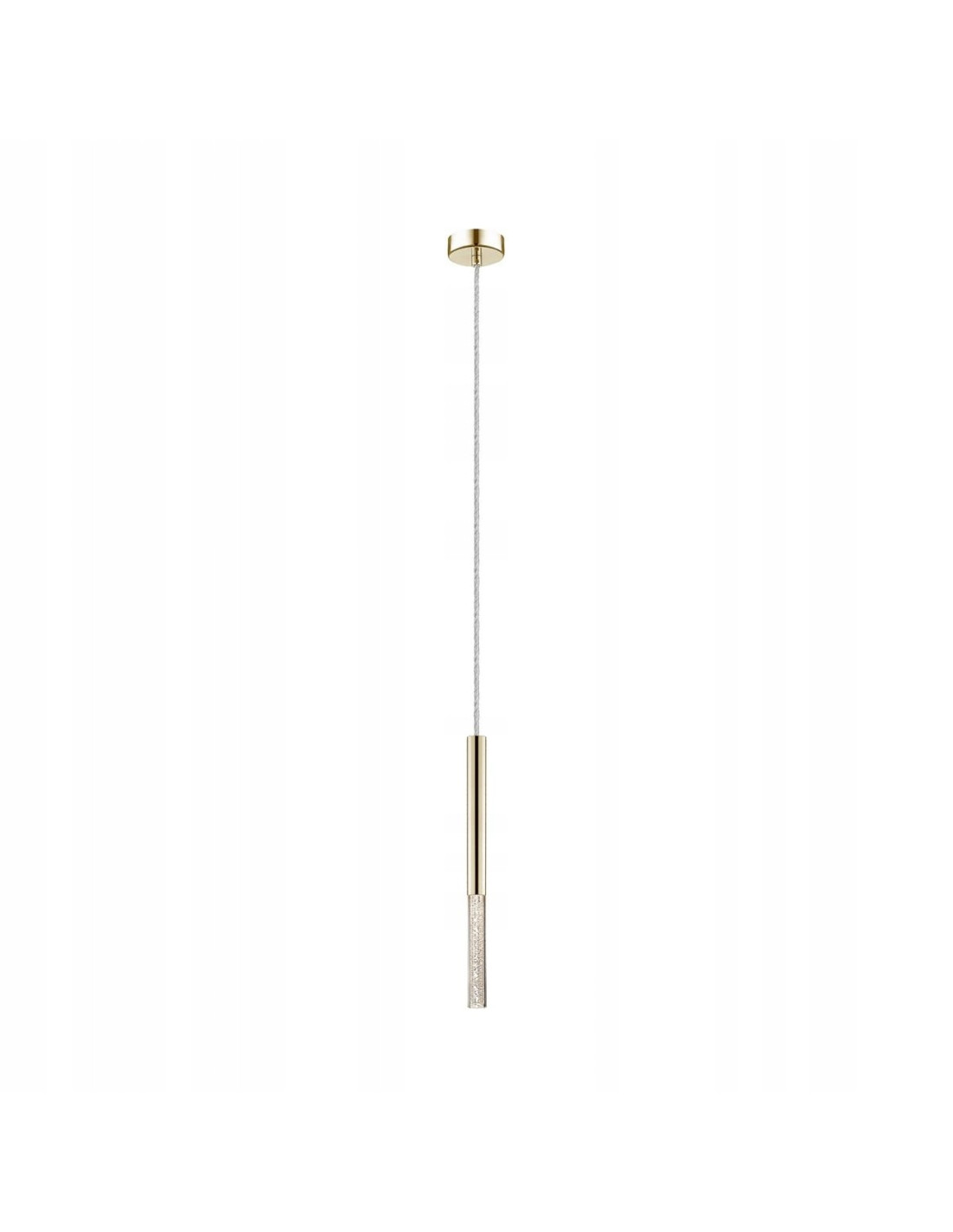 Nowoczesna lampa wisząca Tuba glamour w odcieniu jasnego złota to doskonały wybór dla osób ceniących elegancję i styl. Ta wyjątkowa lampa posiada transparentny klosz wypełniony bąbelkami powietrza, co sprawia, że każdy włączony element wywołuje efektowny, optyczny akcent w Twoim wnętrzu.
