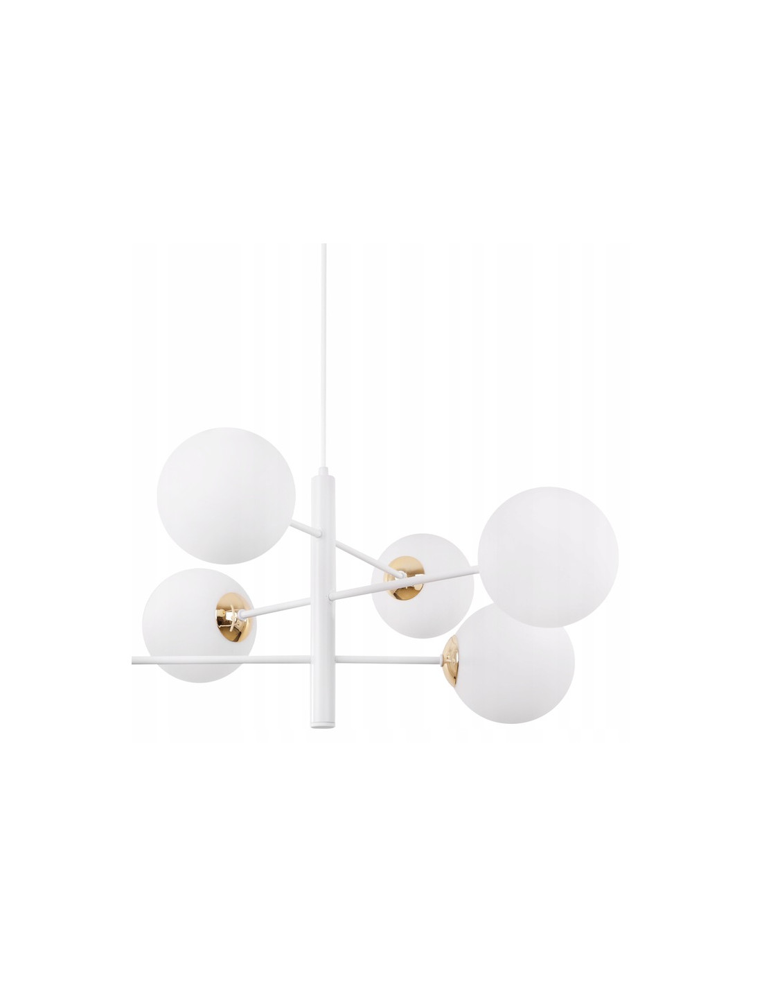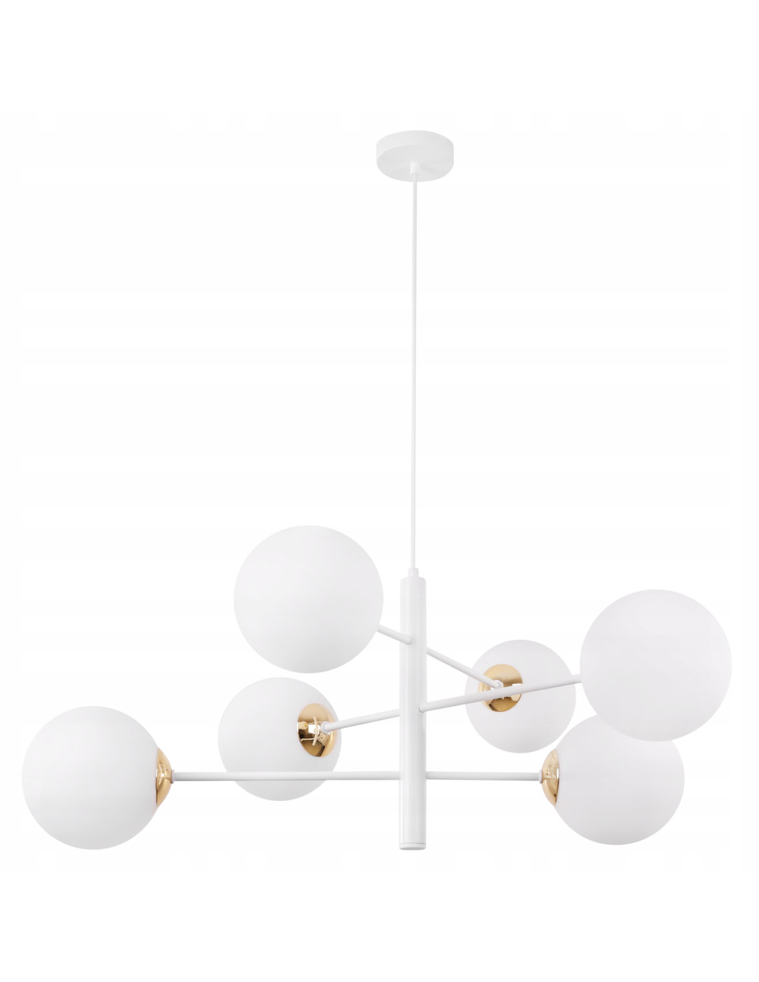 Lampa glamour VICENZA to doskonały wybór dla osób poszukujących stylowego i nowoczesnego oświetlenia do dużych pomieszczeń. Jej elegancki design oraz harmonijna forma sprawiają, że staje się centralnym punktem każdego wnętrza. Okrągłe, białe klosze skutecznie rozpraszają światło, tworząc przyjemną atmosferę pełną subtelnego blasku.