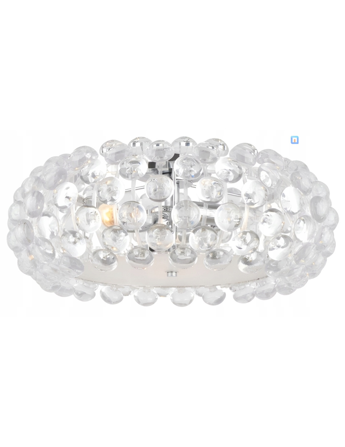 W centrum plafonu znajdują się okrągłe, przezroczyste elementy, które przypominają szkło lub kryształ, nadając mu luksusowy i nowoczesny wygląd. Koraliki są starannie ułożone wokół centralnego źródła światła, co pozwala na subtelne podkreślenie ich piękna oraz zapewnia miękkie oświetlenie otoczenia. Jako główne źródło światła zastosowano gwint E14, co umożliwia użycie żarówek o maksymalnej mocy 40W.