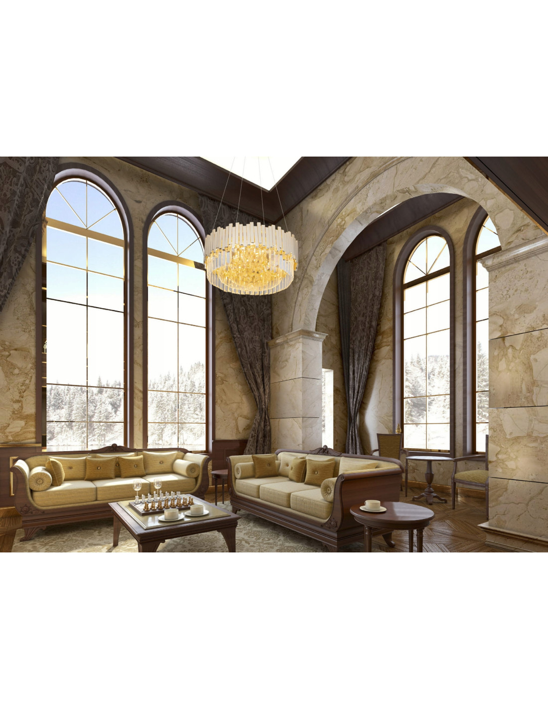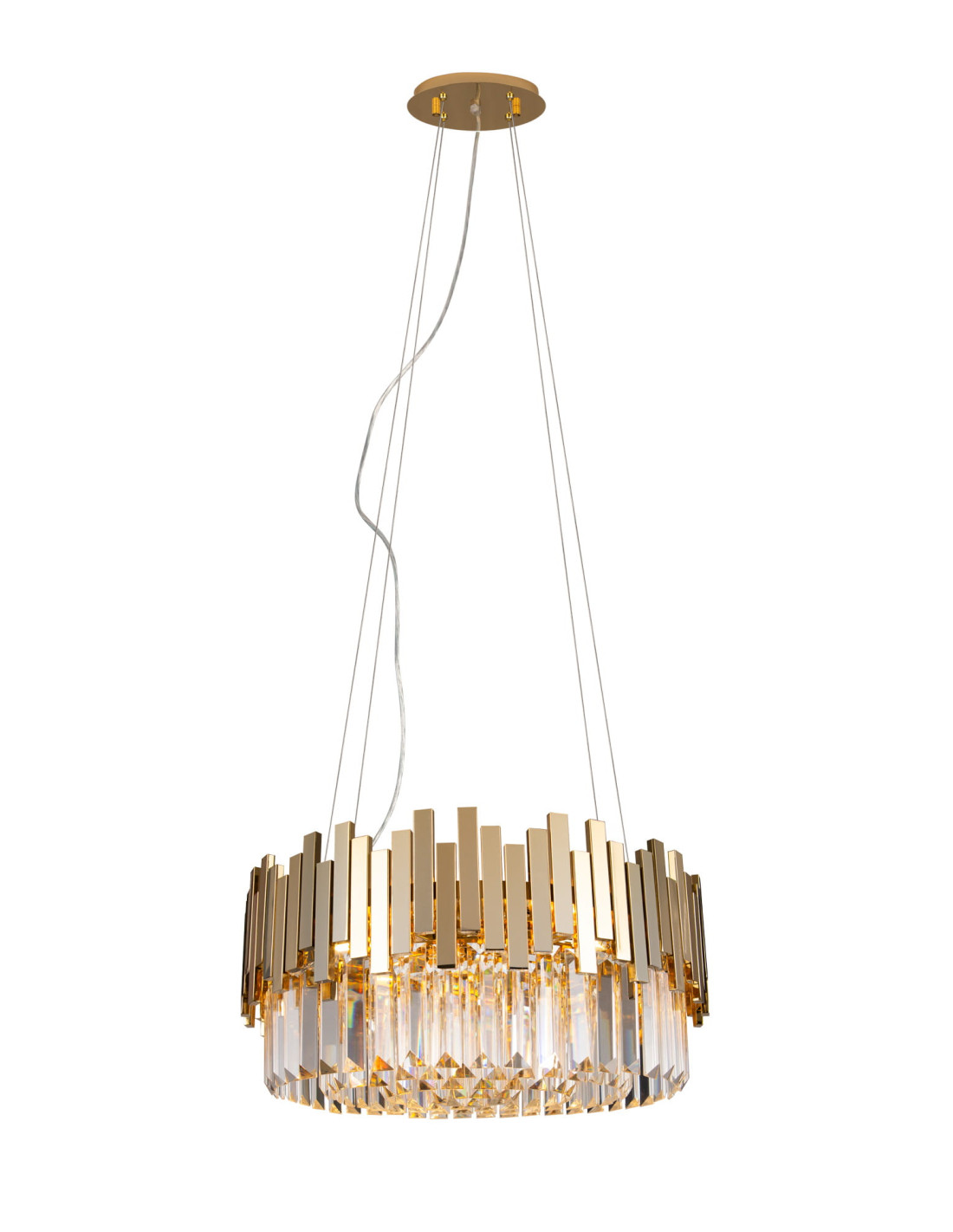 Żyrandol Trend to nie tylko oświetlenie, to prawdziwa dekoracja. Jego złoty kolor w połączeniu z delikatnym blaskiem kryształów sprawia, że idealnie komponuje się z nowoczesnymi oraz klasycznymi aranżacjami. To doskonały wybór dla osób, które cenią sobie estetykę i wyrafinowanie w każdym detalu swojego otoczenia.